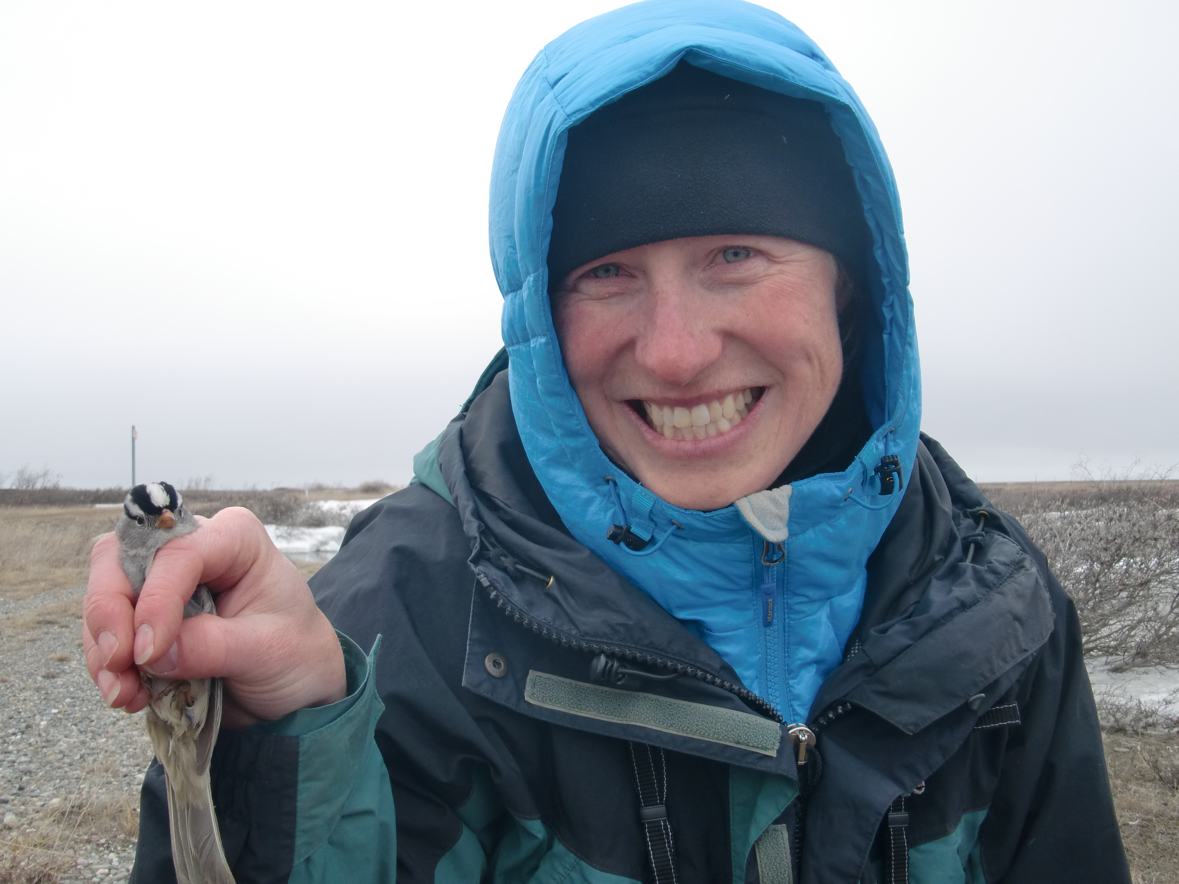 Melissa Barker holds a white crowned sparrow. About 30 miles south of Deadhorse, Alaska.