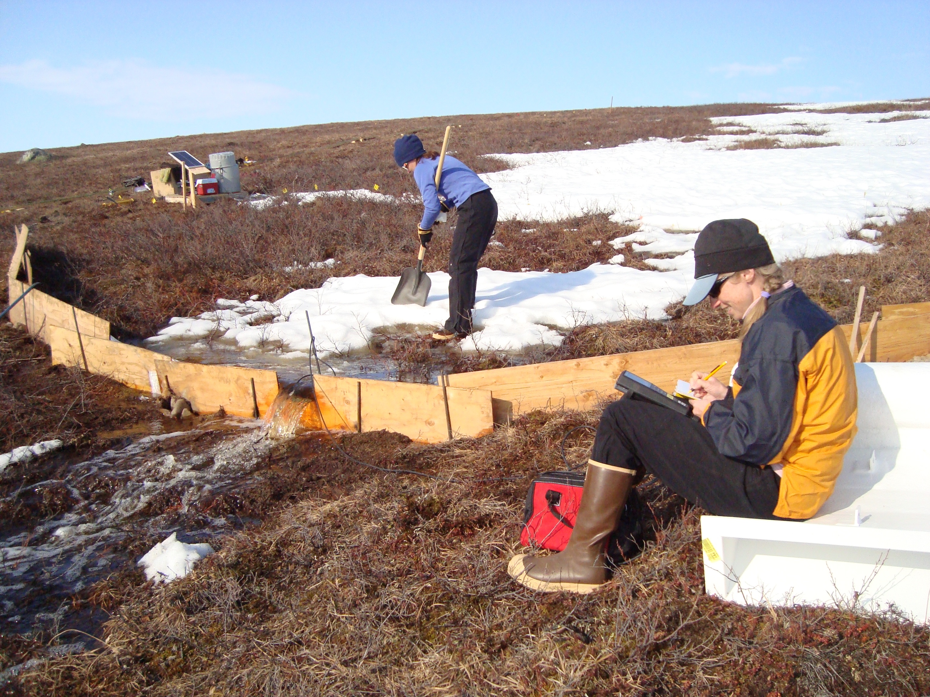 Tamara Harms pours in a salt slug while Melissa Barker records data. In the Kuparuk River Valley near Toolik Field Station, Alaska.