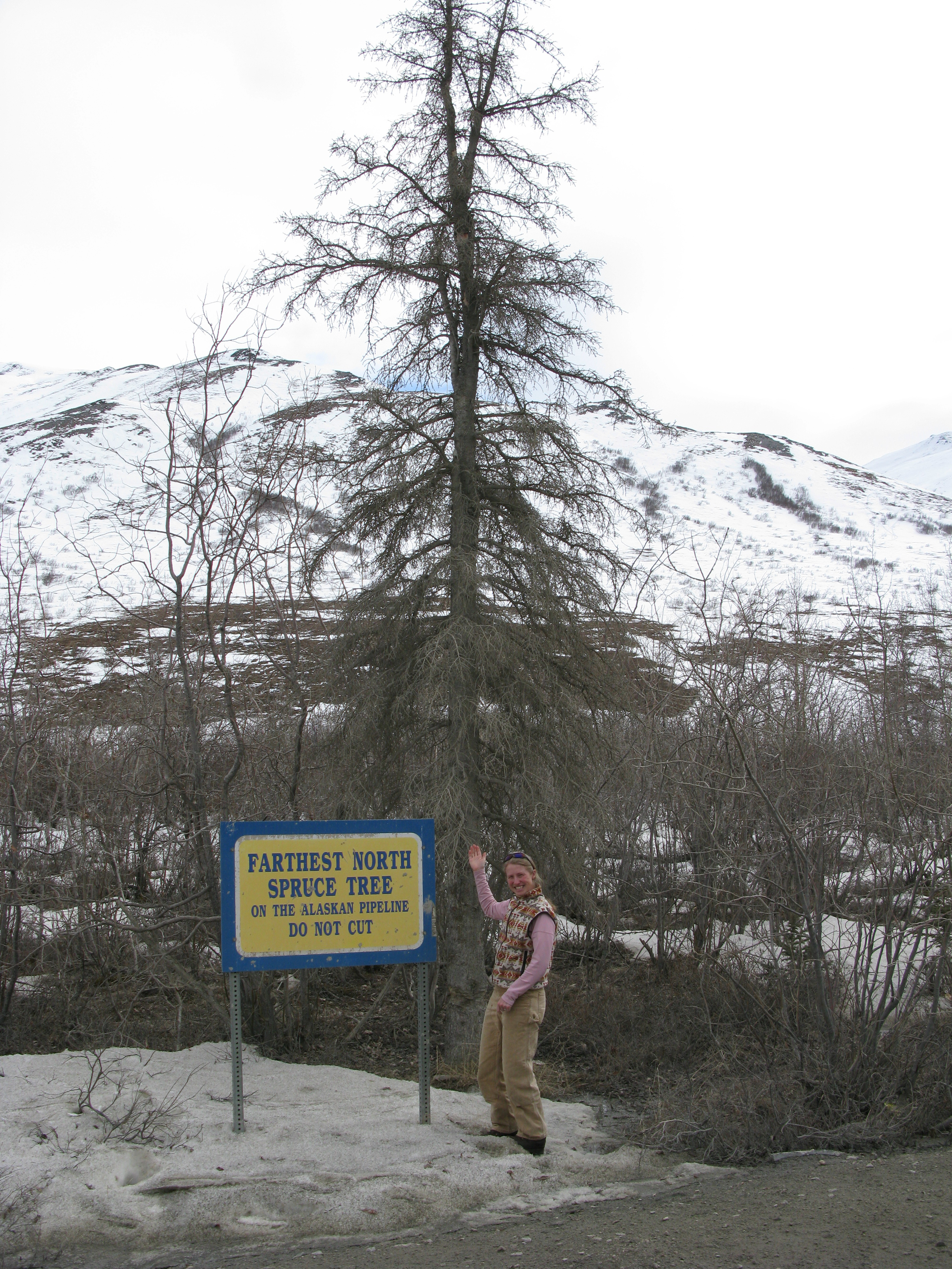 Melissa Barker poses in front of the furthest north spruce tree along the Dalton Highway. Dalton Highway, Alaska.