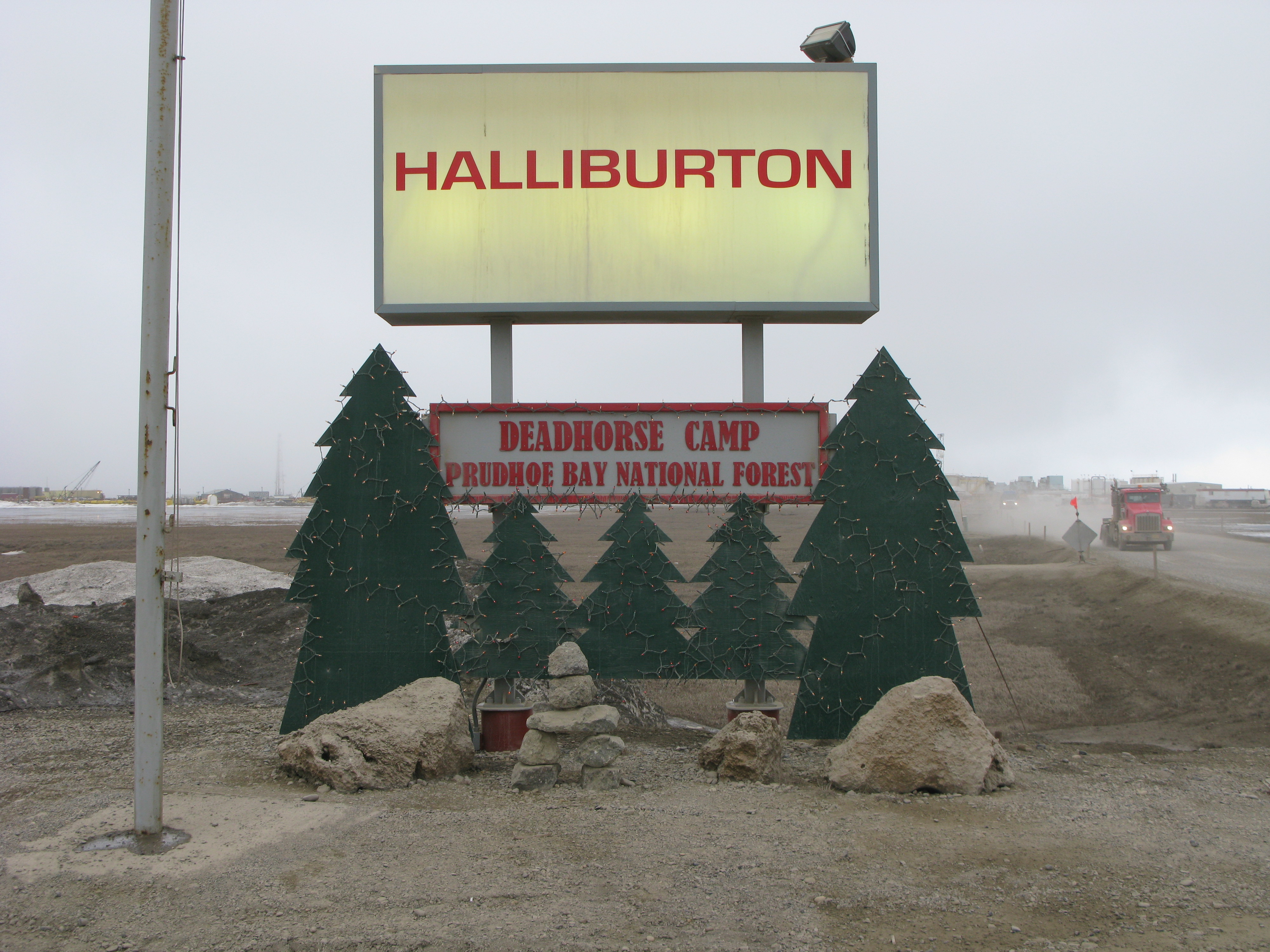 Melissa Barker: "A little humor from one of the oilfield service companies, creating a sign for the Prudhoe Bay National Forest". Deadhorse, Alaska.