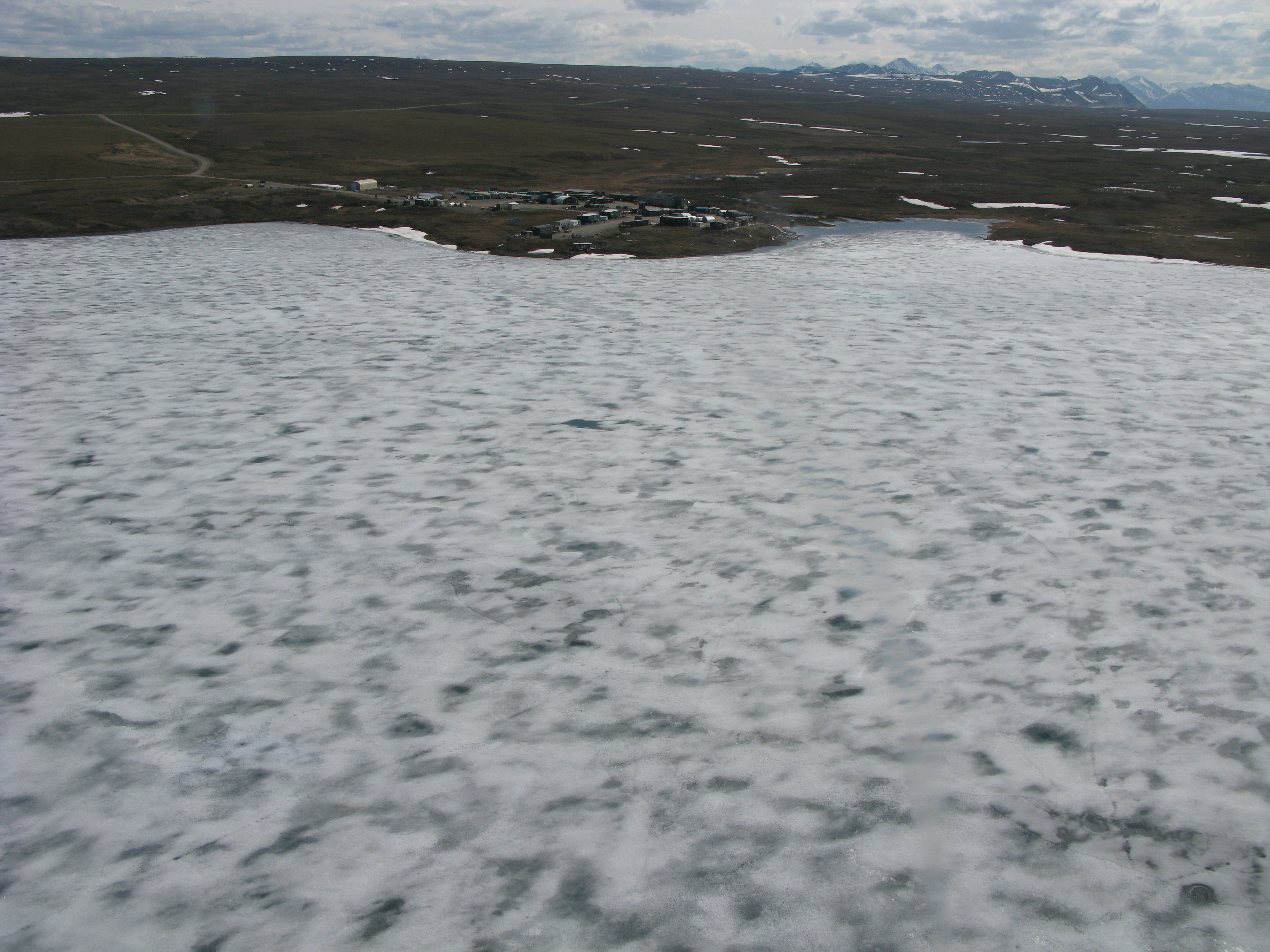A view of Toolik Field Station and a frozen Toolik Lake, as seen from the helicopter. Toolik Field Station, Alaska.