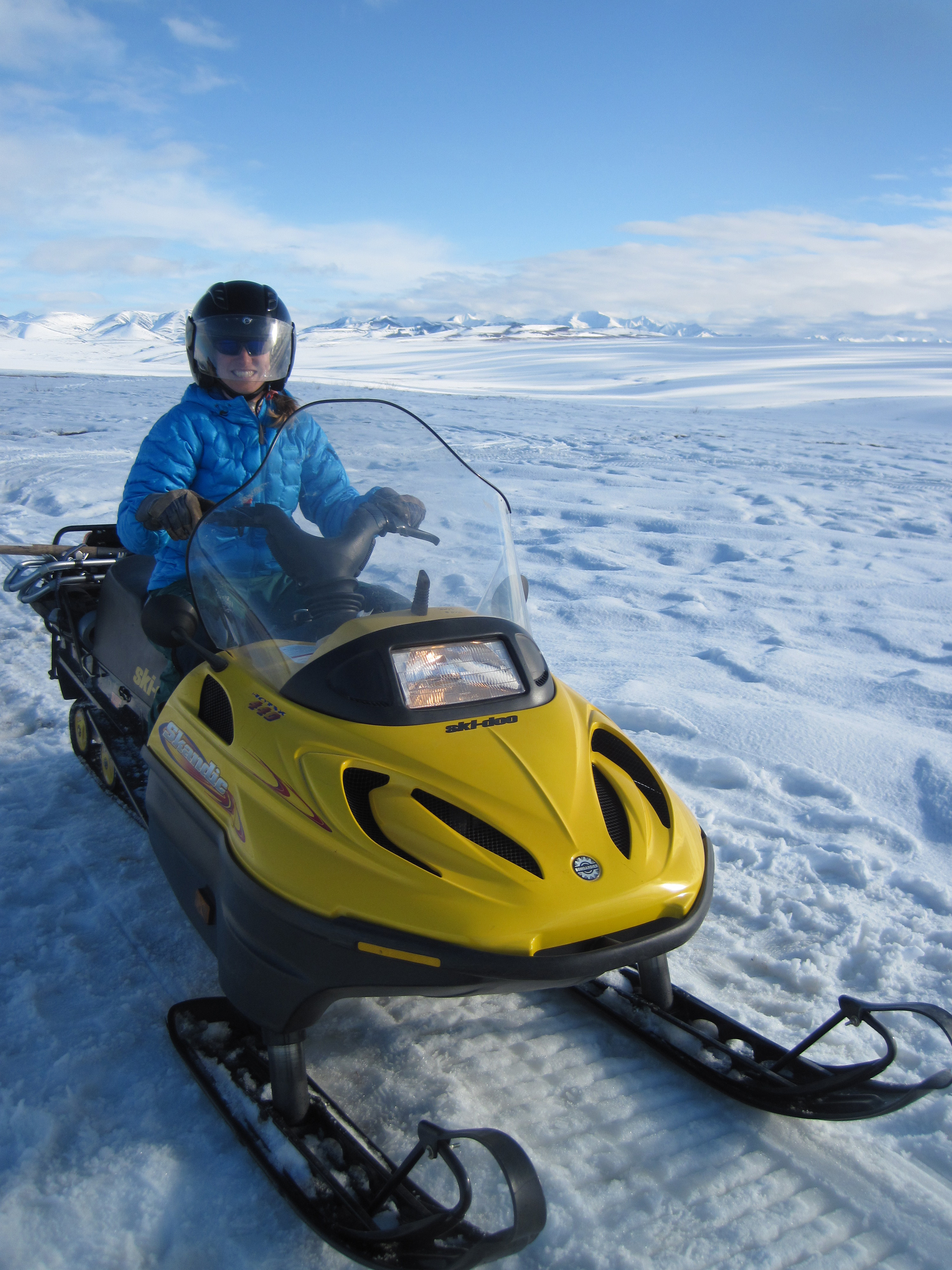 Melissa Barker drives a snowmobile. Toolik Field Station, Alaska.