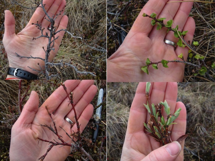 The shrubs on the left side were outside the greenhouse and the shrubs on the right side were inside the greenhouse. In the Kuparuk River Valley near Toolik Field Station, Alaska.