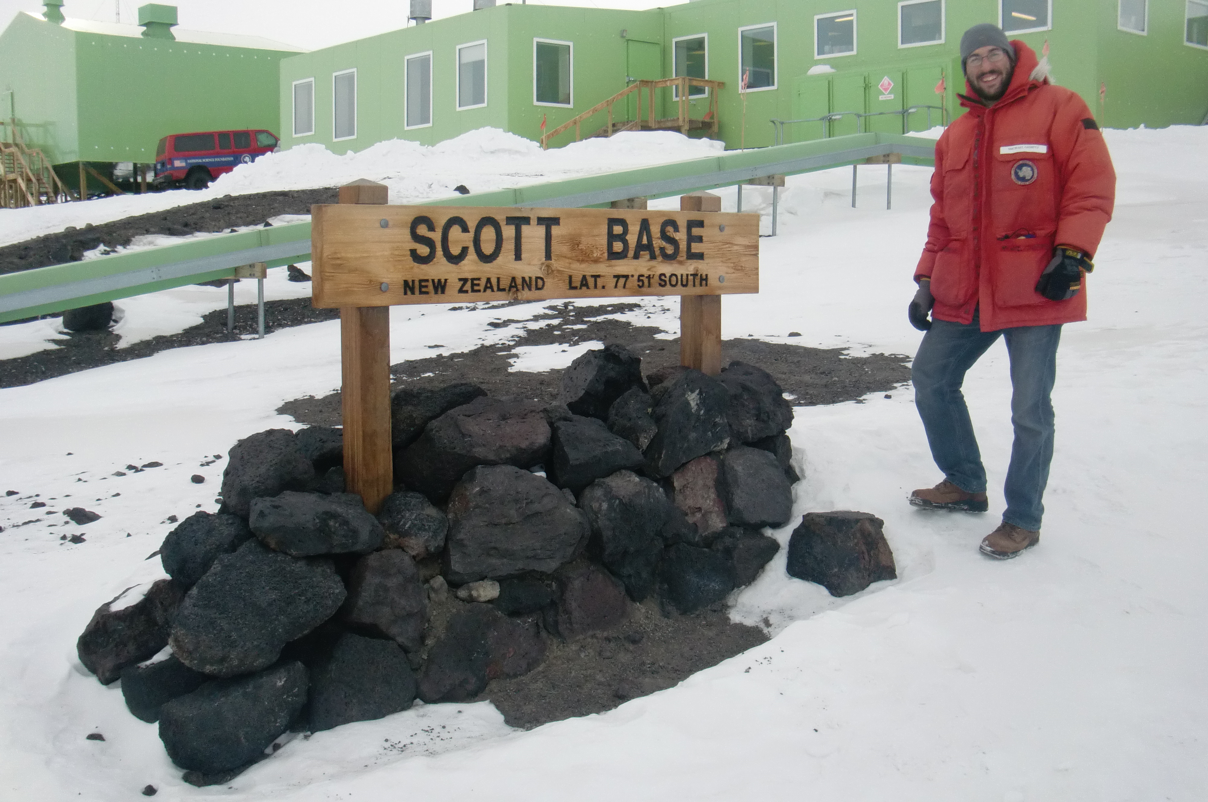 Mike Osmont poses at the Scott Base sign. McMurdo Station, Antarctica.