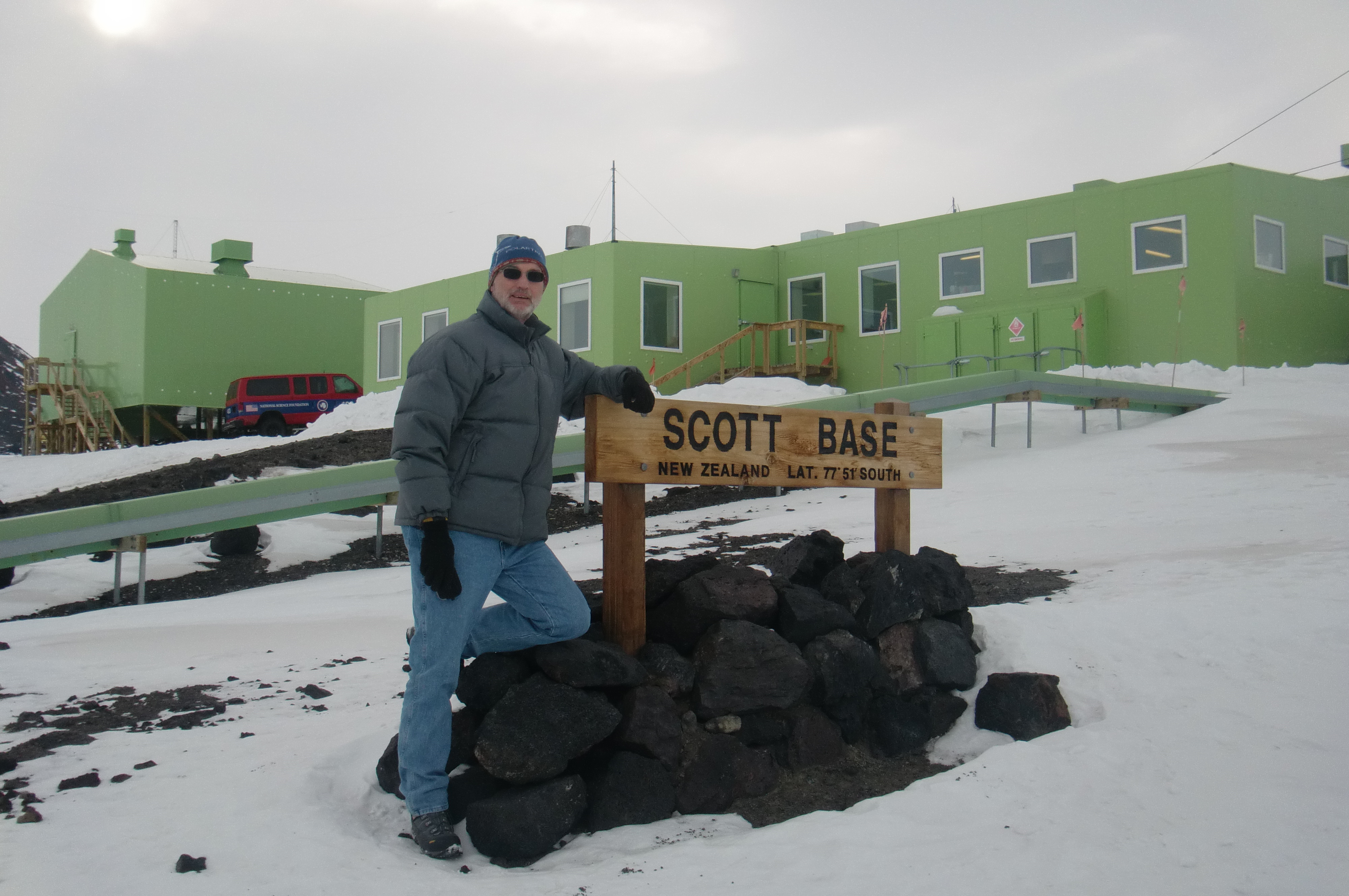 Mike LeBaron poses at the Scott Base sign McMurdo Station, Antarctica.
