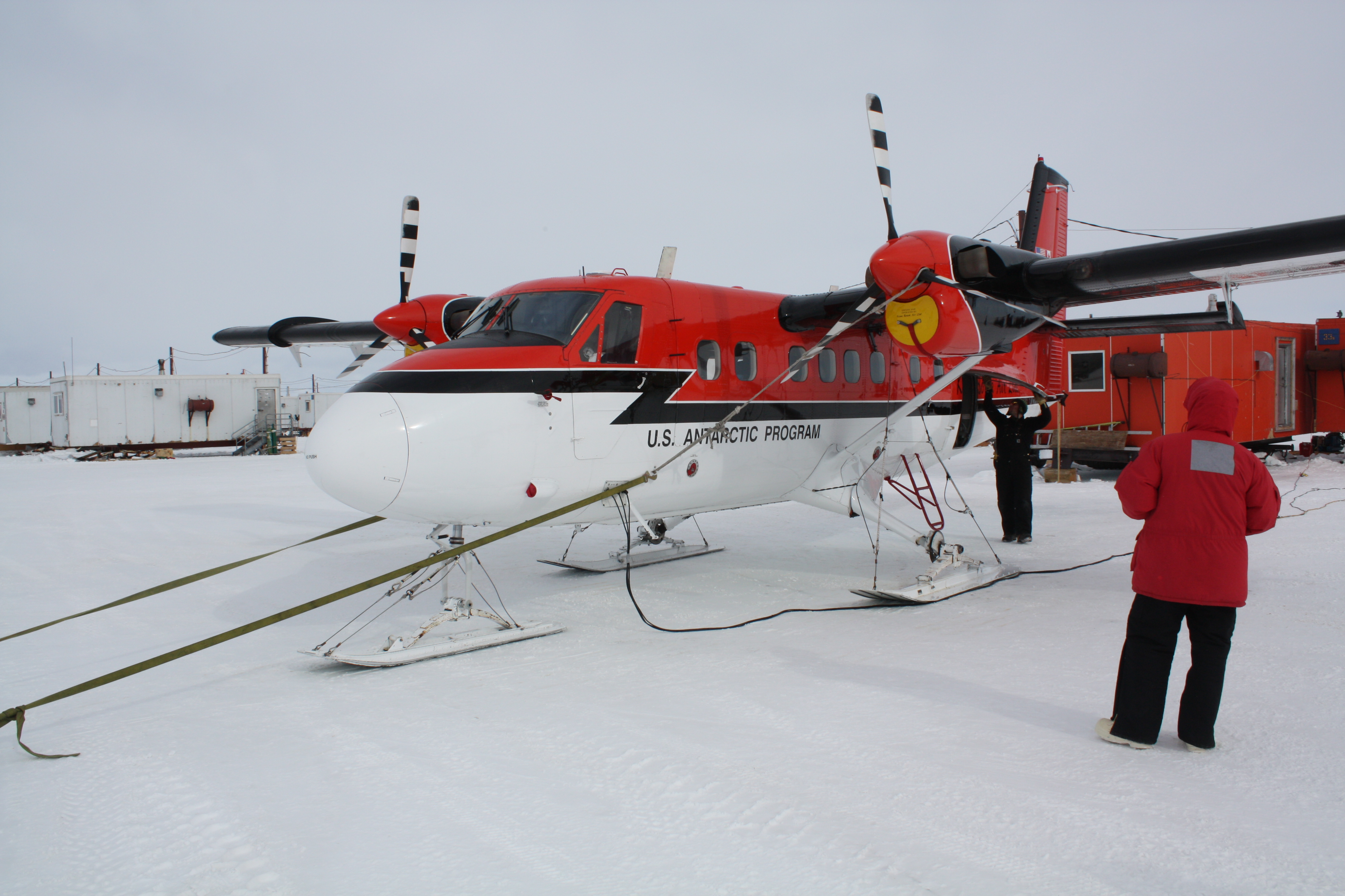 John Winans stands next to the Twin Otter airplane. McMurdo Station, Antarctica.