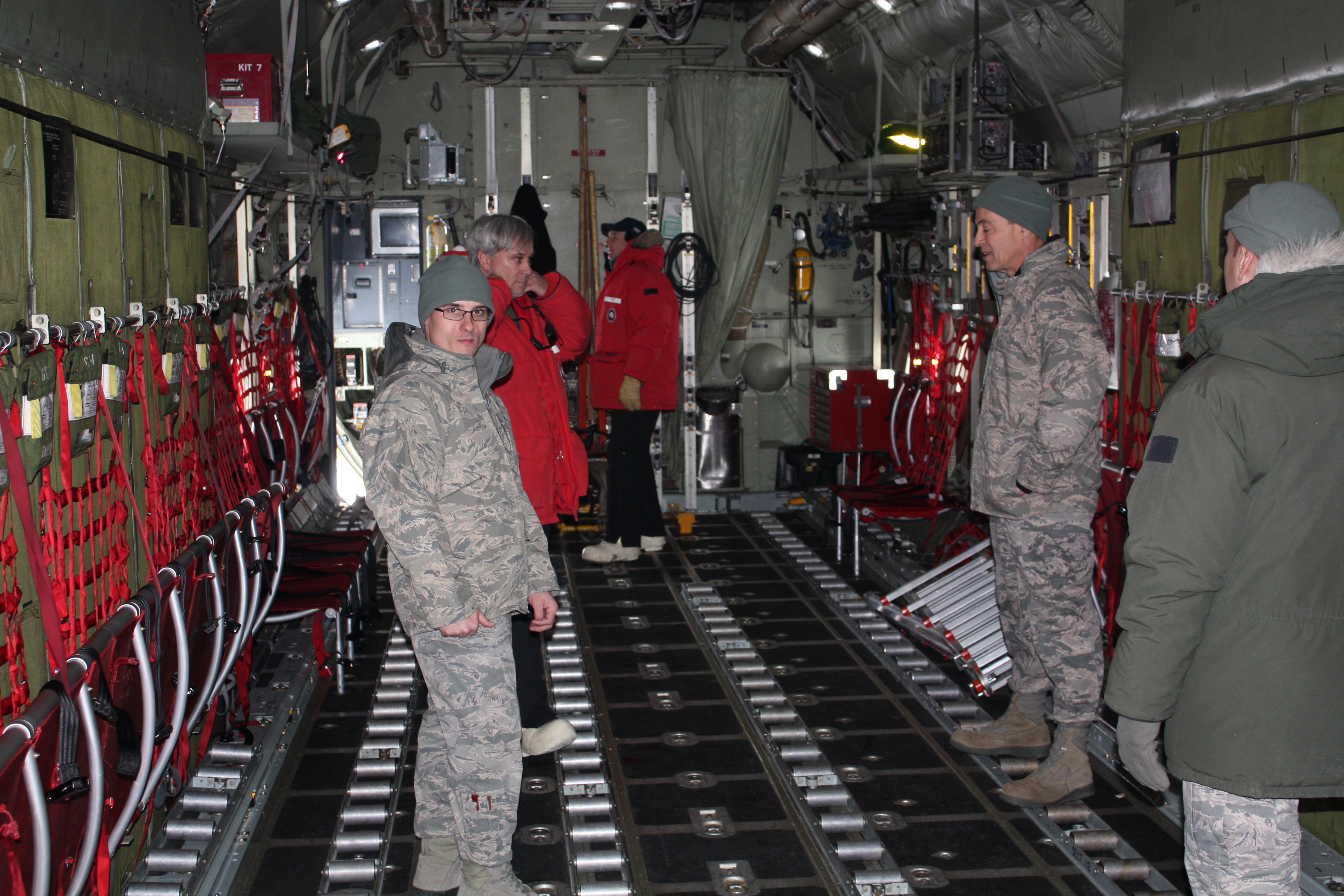 This is the cargo area and crew of the LC-130. The passenger seats are the folded red panels along the side. McMurdo Station, Antarctica.
