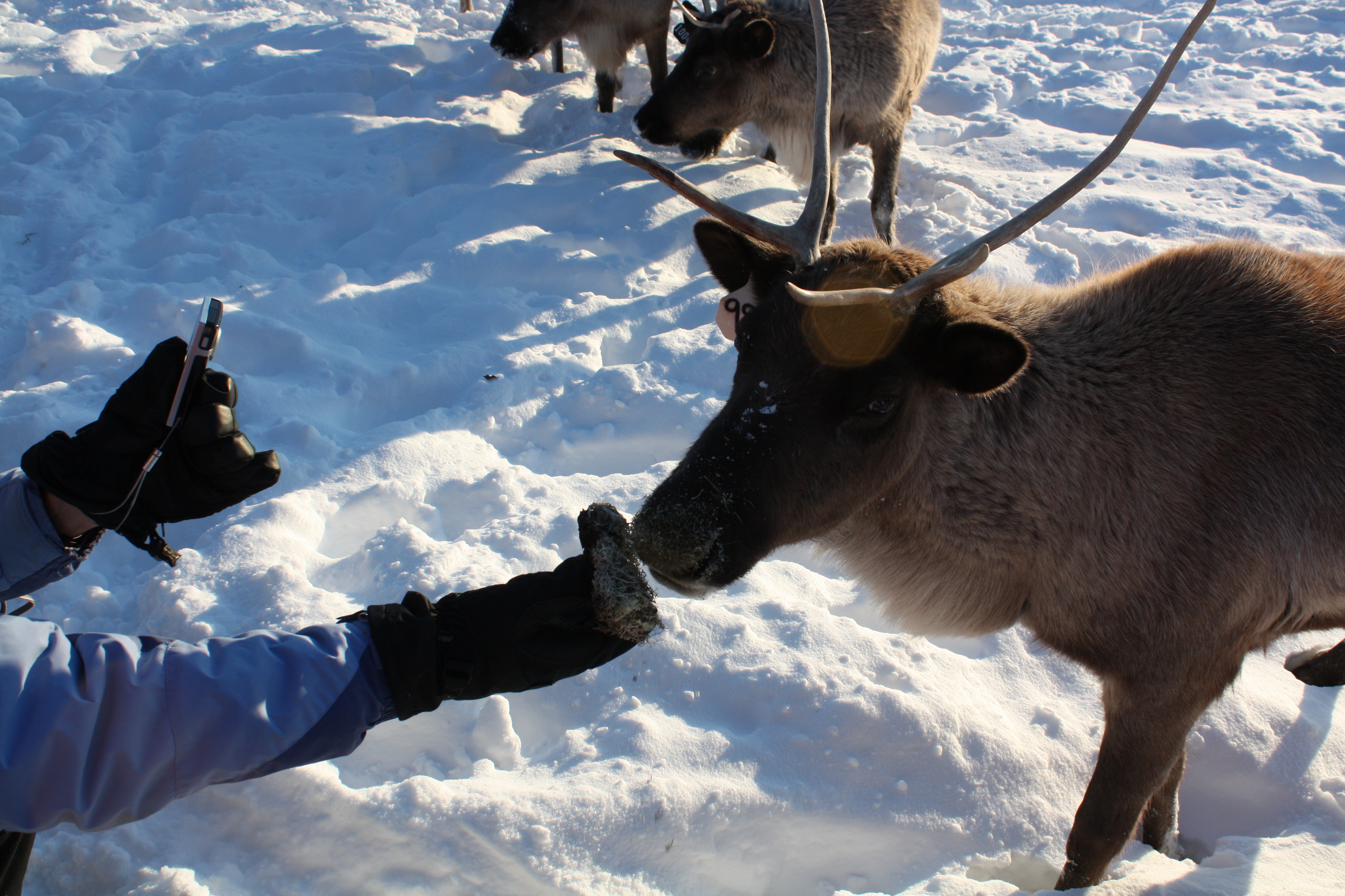PolarTREC teachers feed lichen to reindeer at the Reindeer Research Program at the University of Alaska Fairbanks.