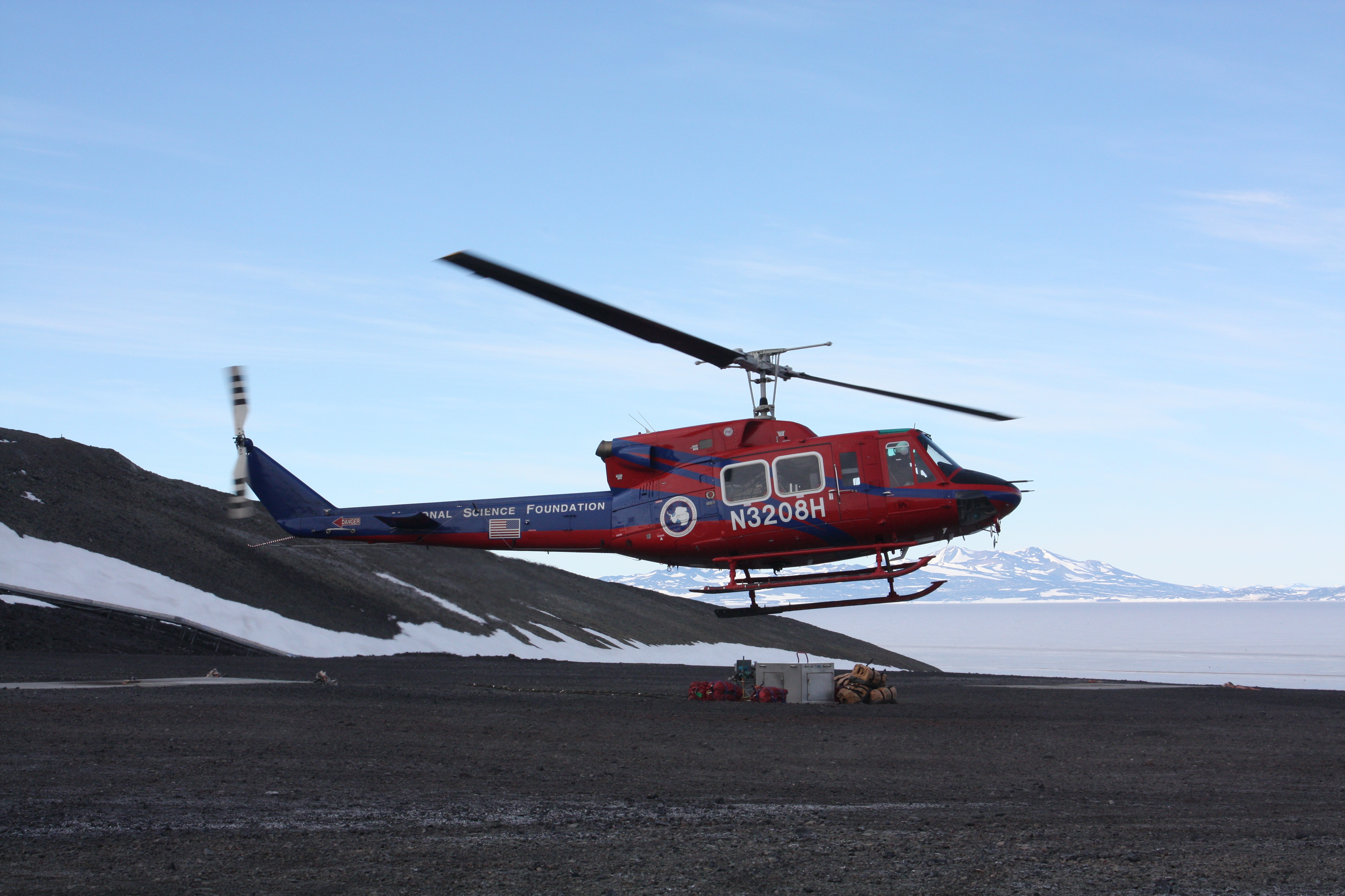 A helicopter takes off from the pad. McMurdo Station, Antarctica.