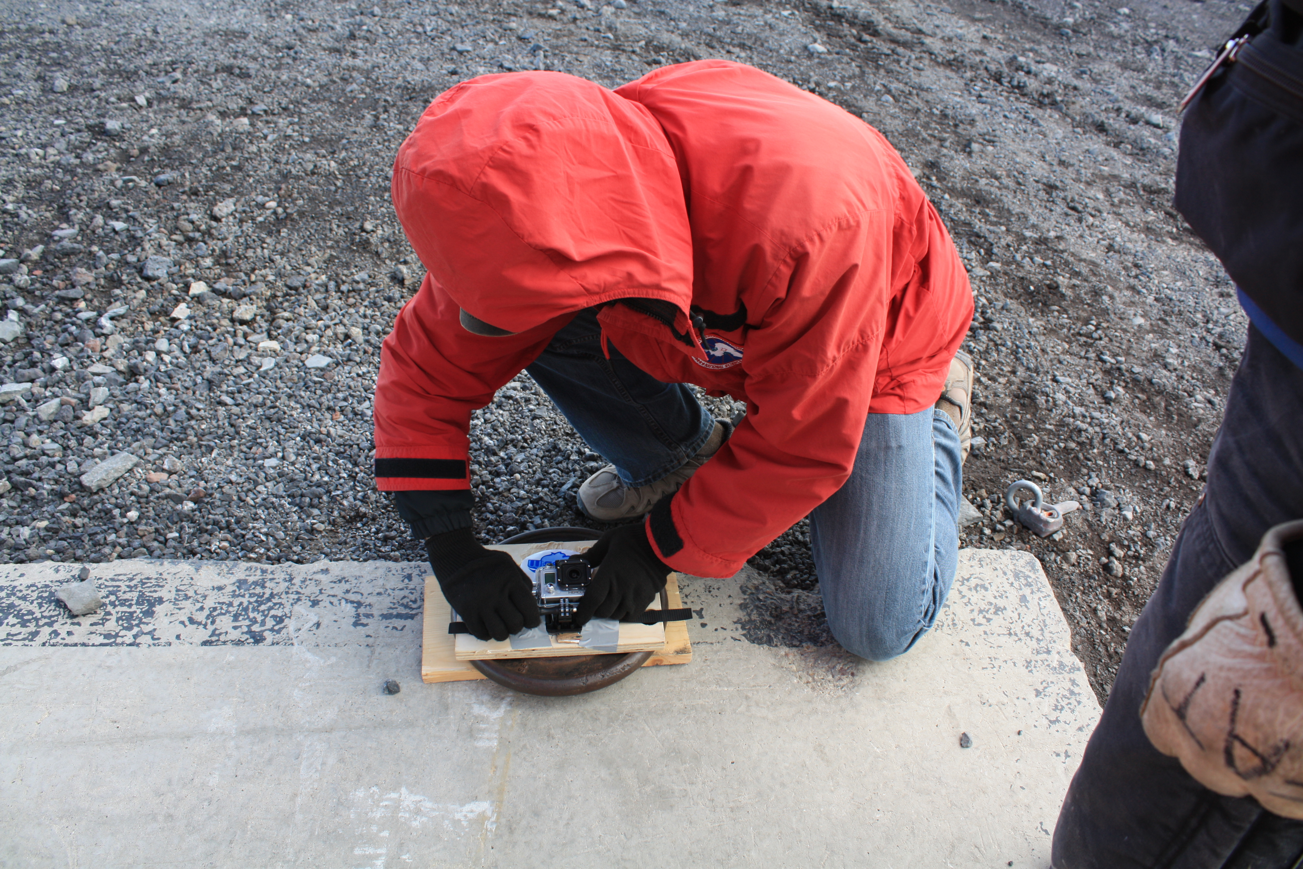 Dave Monk gets CHIMP ready to take photos. CHIMP is a camera mount for holding a camera under a helicopter. It stands for Camera Helicopter Isolation Mounting Platform. McMurdo Station, Antarctica.