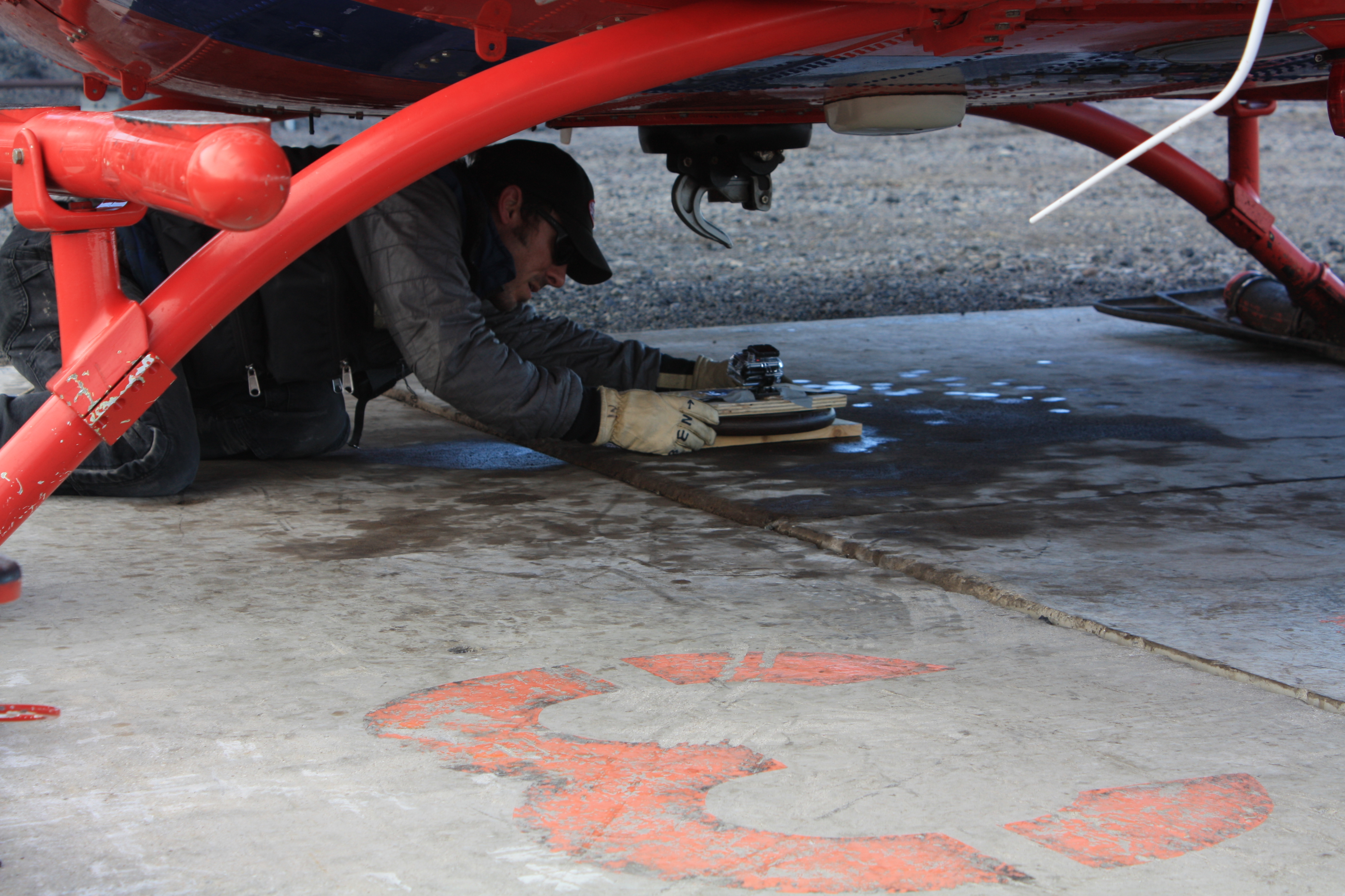 The CHIMP is put into posiiton under the helicopter. McMurdo Station, Antarctica.