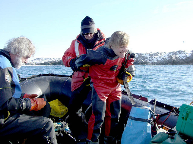 Maggie Amsler prepares to SCUBA dive. Palmer Station, Antarctica.