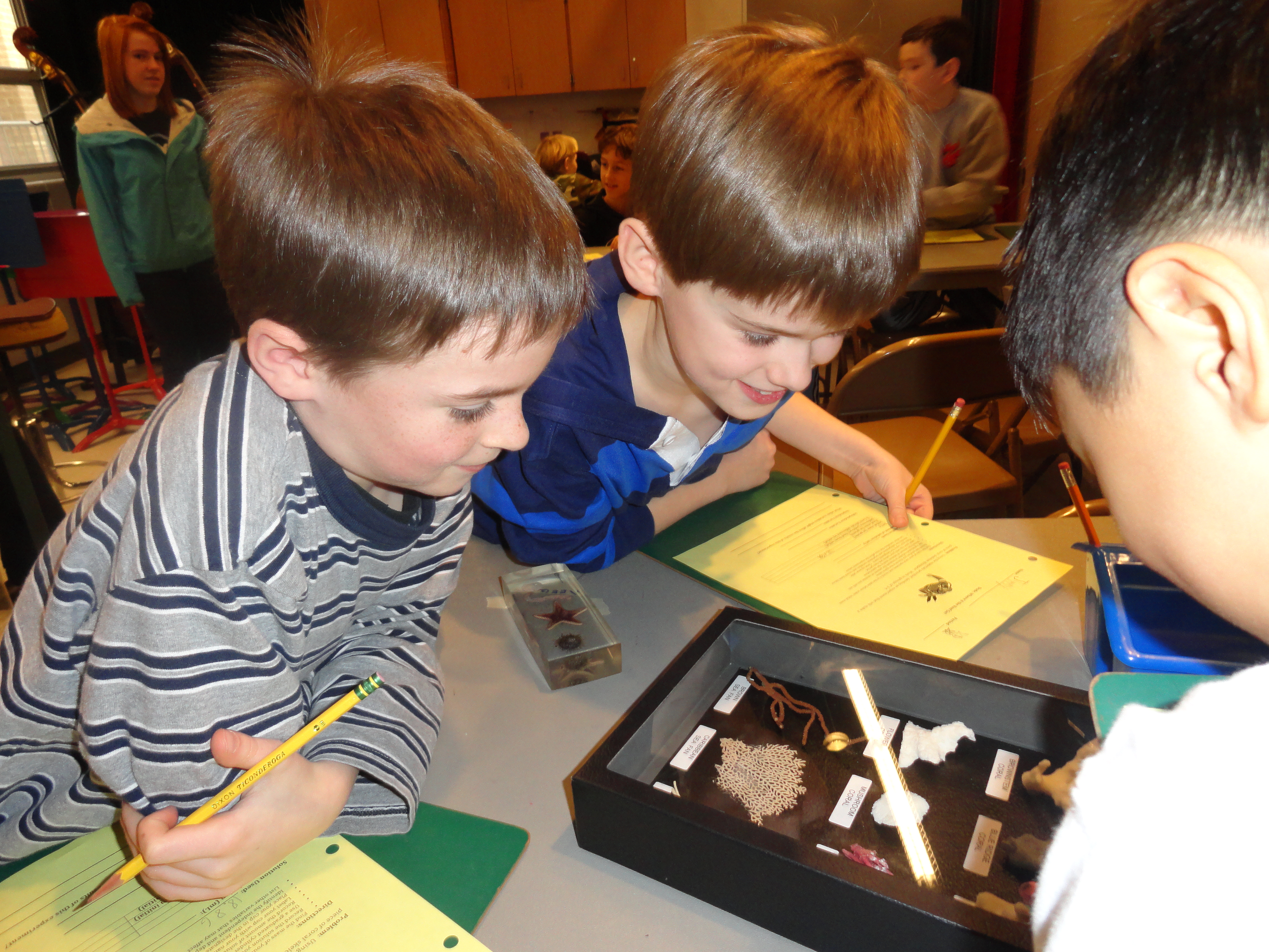 During a visit from the Polar Ambassadors, elementary students observe coral and echinoderm specimens. Park Forest Elementary School, State College, Pennsylvania.