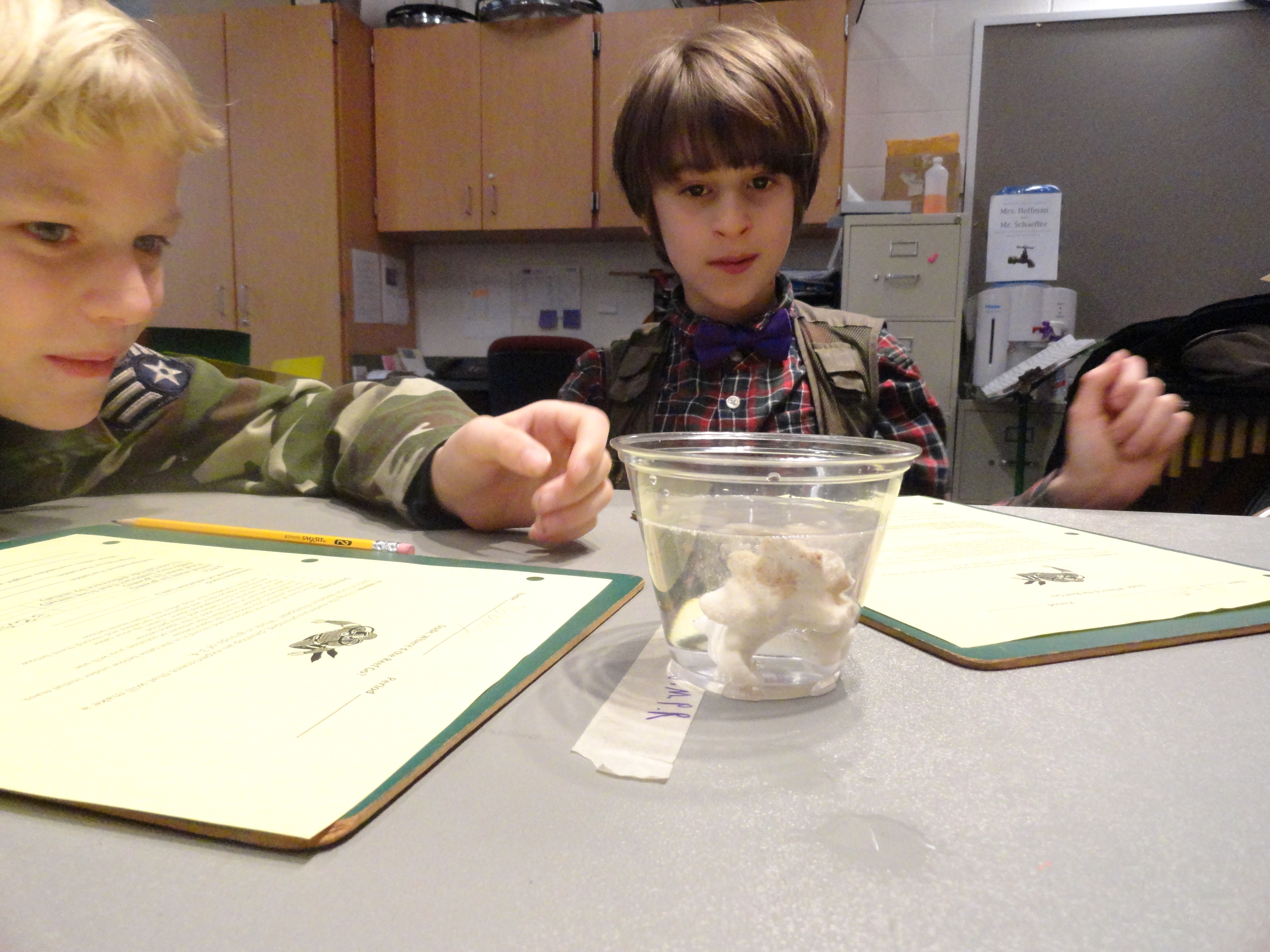 During a visit from the Polar Ambassadors, elementary students observe coral in an acidic solution. Park Forest Elementary School, State College, Pennsylvania.