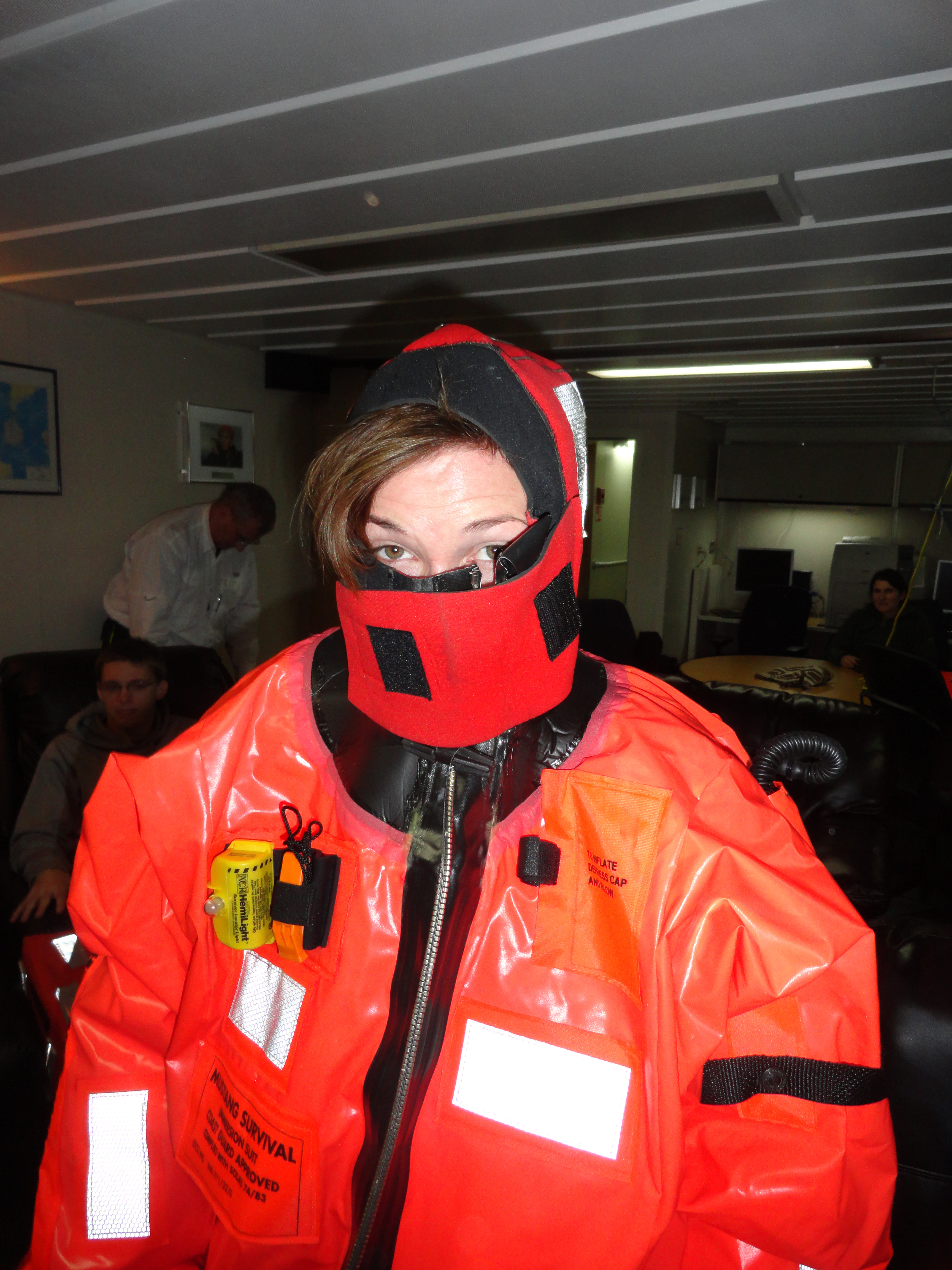 Nell Herrmann wearing her survival suit. Aboard the RV Laurence M. Gould icebreaker in the Strait of Magellan, Chile.