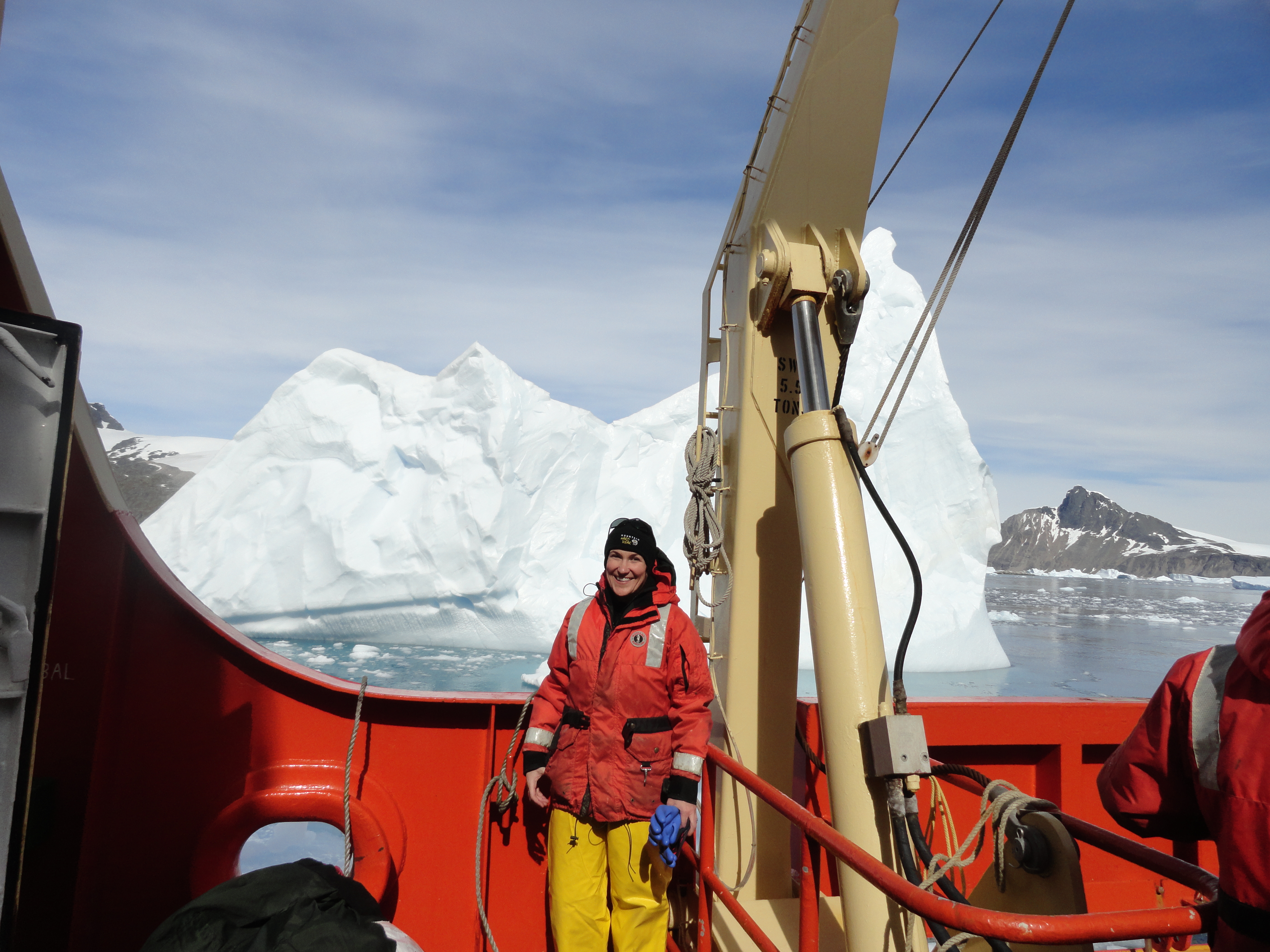 Nell Herrmann poses on the deck of the LMG near the Western Antarctic Peninsula. Aboard the RV Laurence M. Gould icebreaker at Cierva Point, Antarctica.