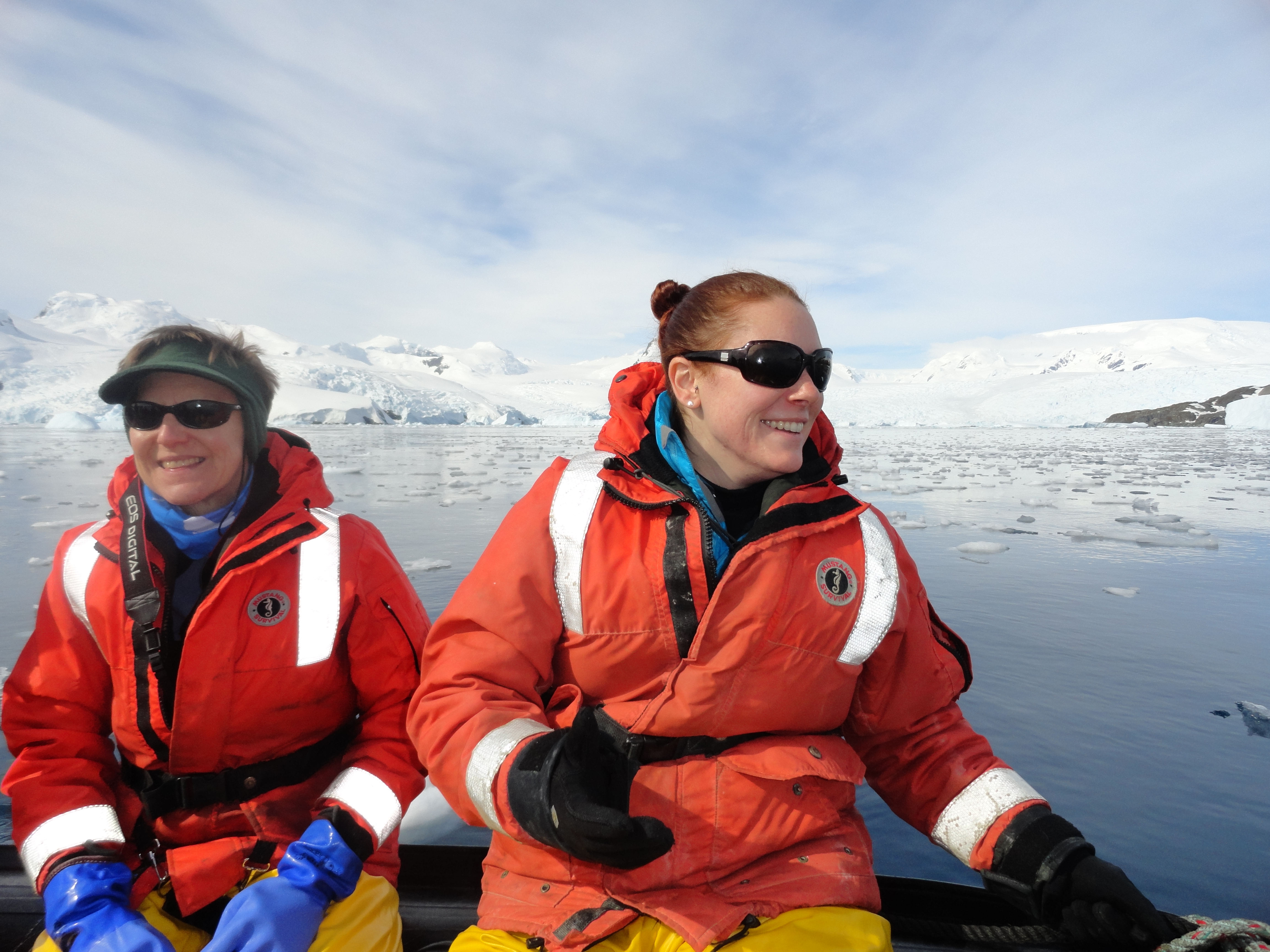 Scientist Maggie Amsler and graduate student Julie Schram on a zodiac near Palmer Station, Antarctica.
