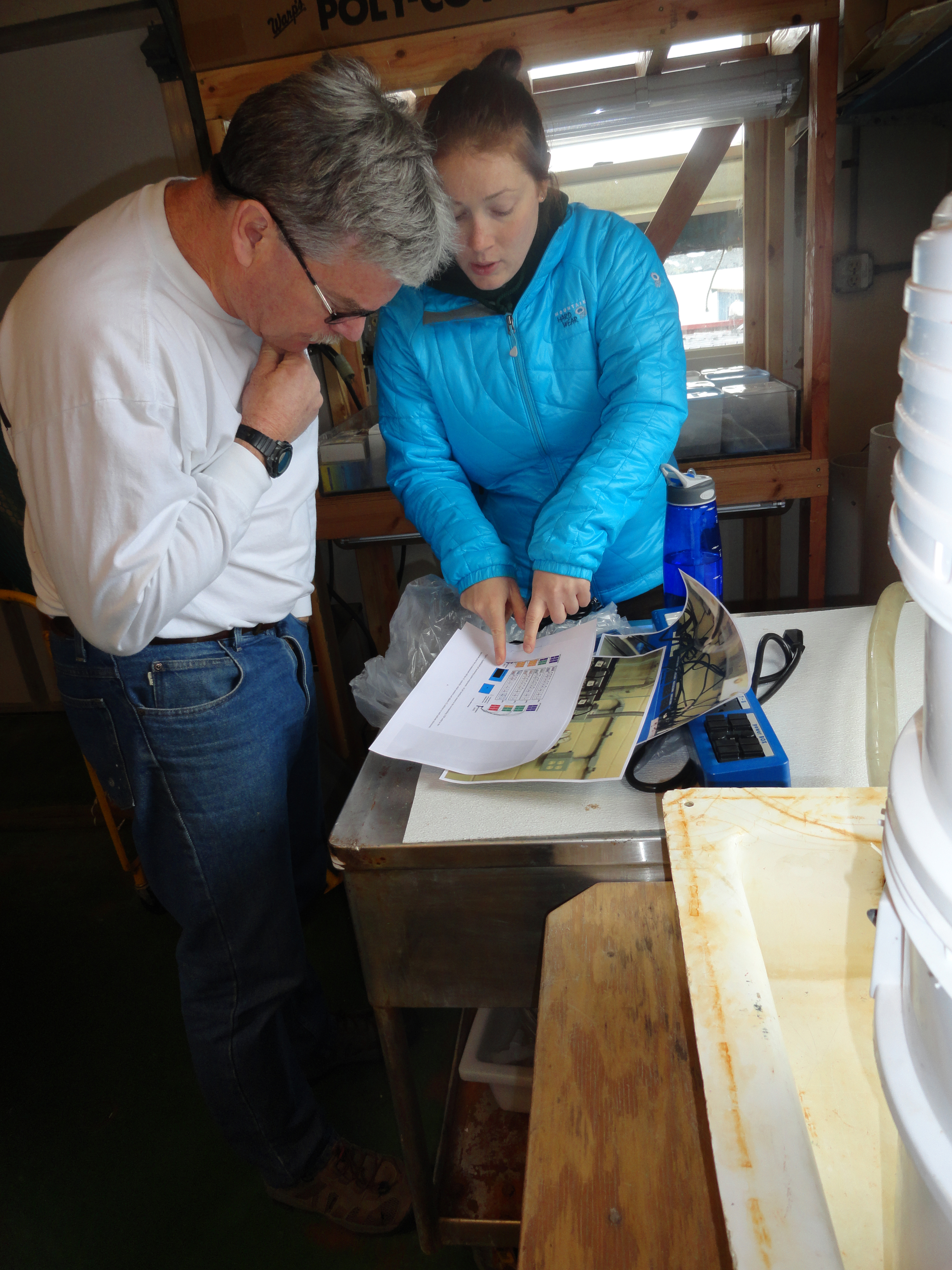 Dr. McClintock and Julie Schram discuss the logistics of their ocean acidification experiment. Palmer Station, Antarctica.