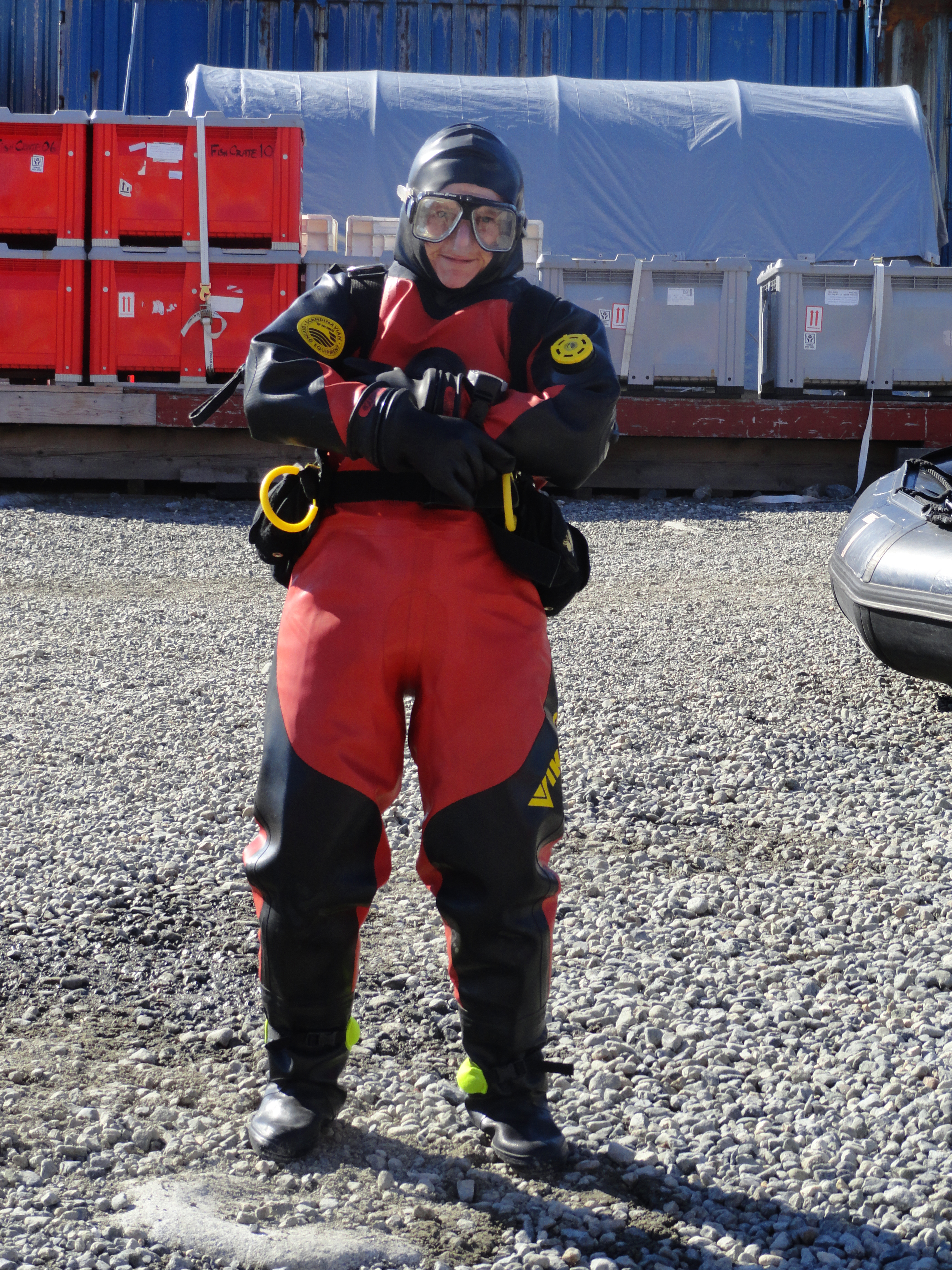 Kate Schoenrock, a marine biology graduate student, prepares for her checkout dive. Palmer Station, Antarctica.