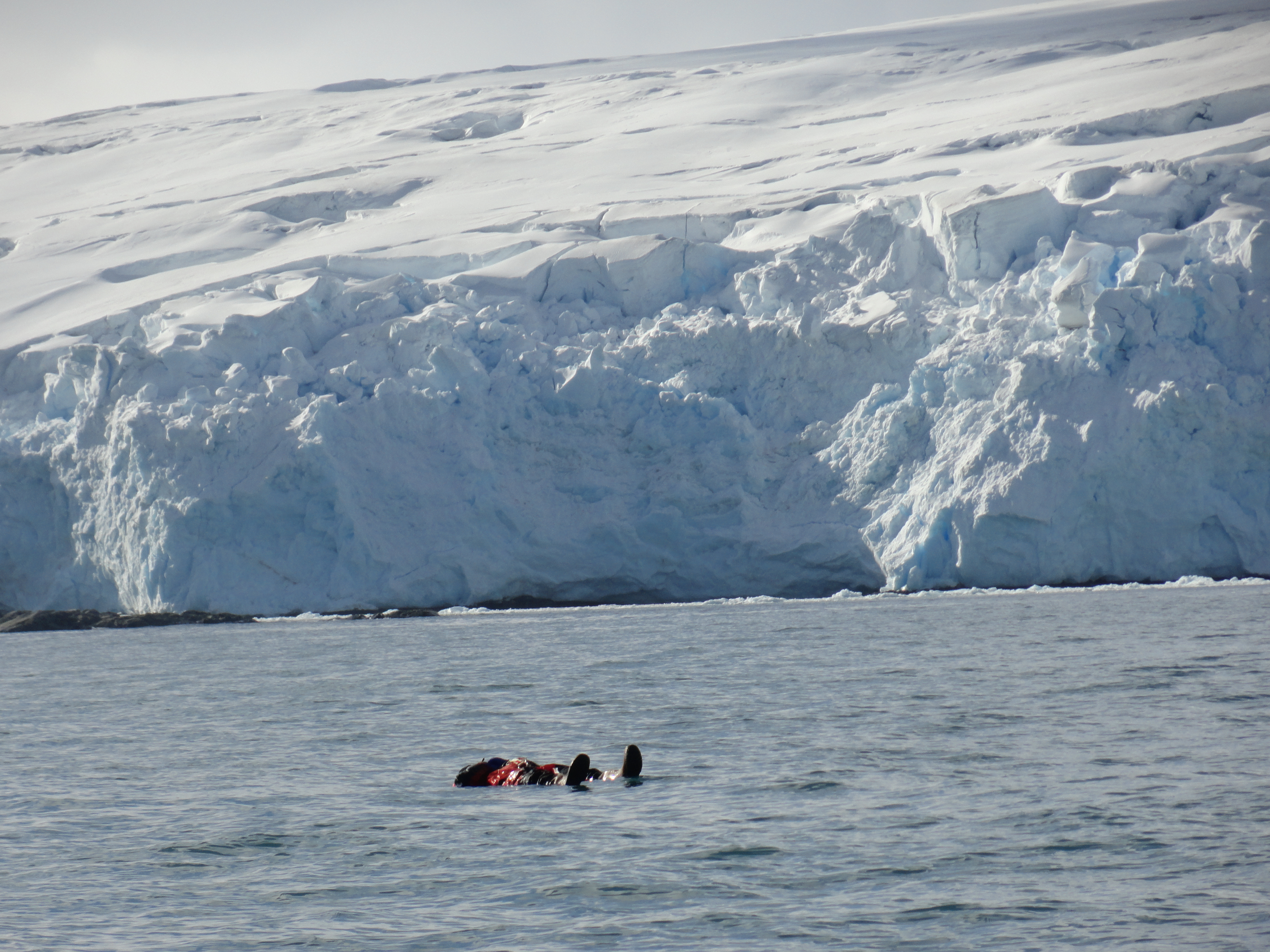 Nell Herrmann floats in the Southern Ocean with the Marr Glacier in the background. Palmer Station, Antarctica.