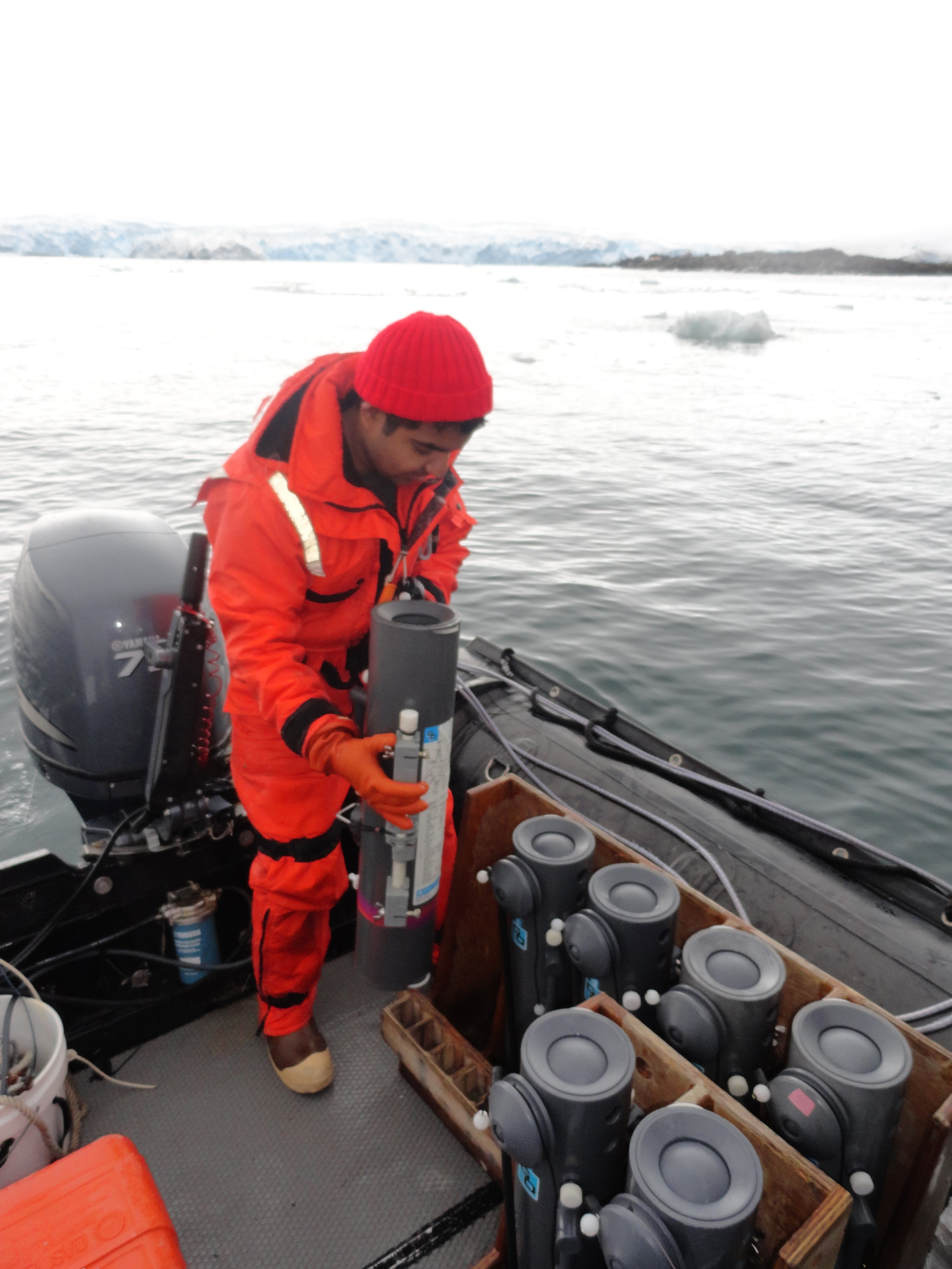 Nikhil Murgai prepares Niskin bottles to collect water samples. Palmer Station, Antarctica.