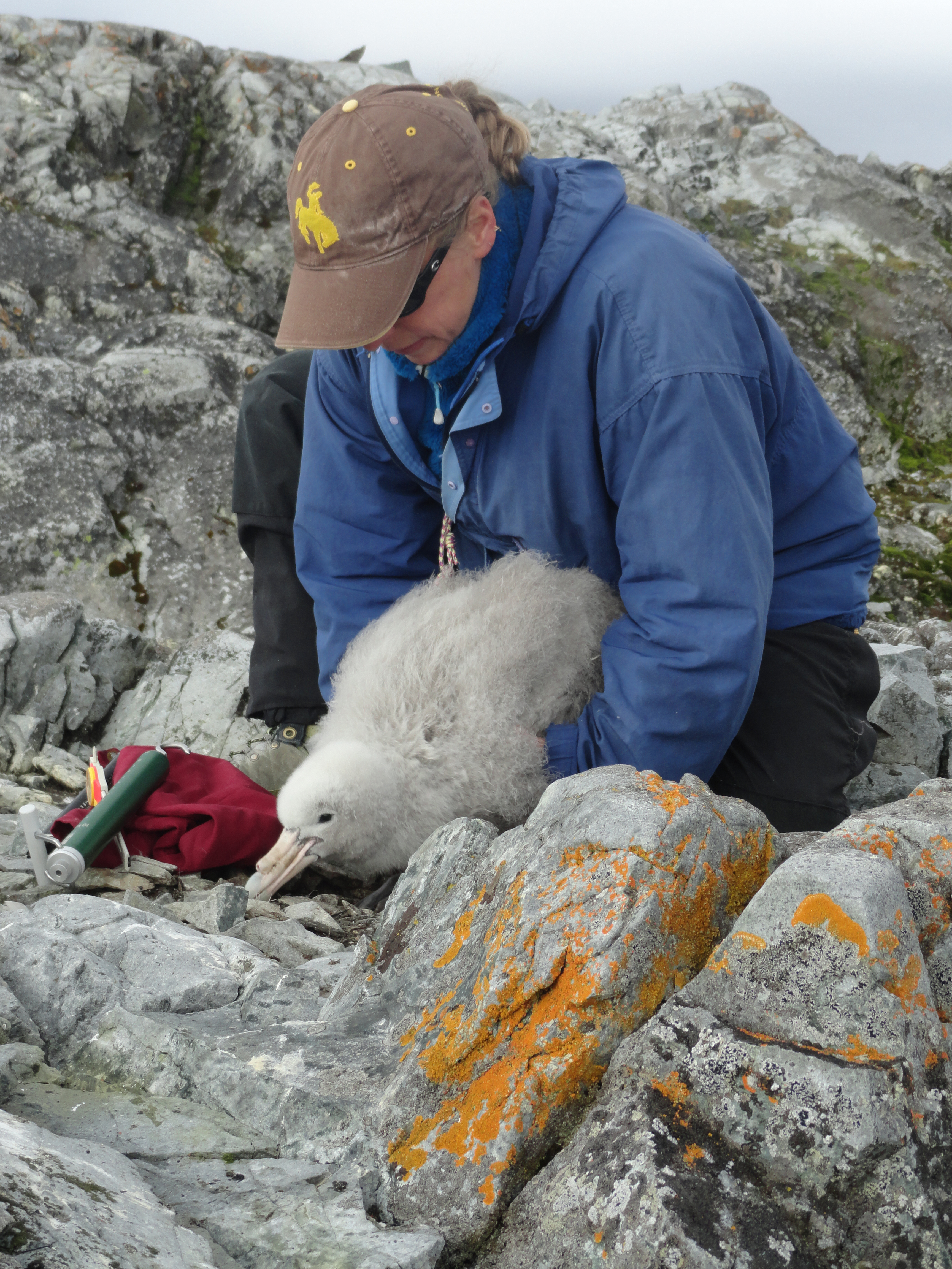 Donna Fraser collects data on a giant petrel chick. Palmer Station, Antarctica.