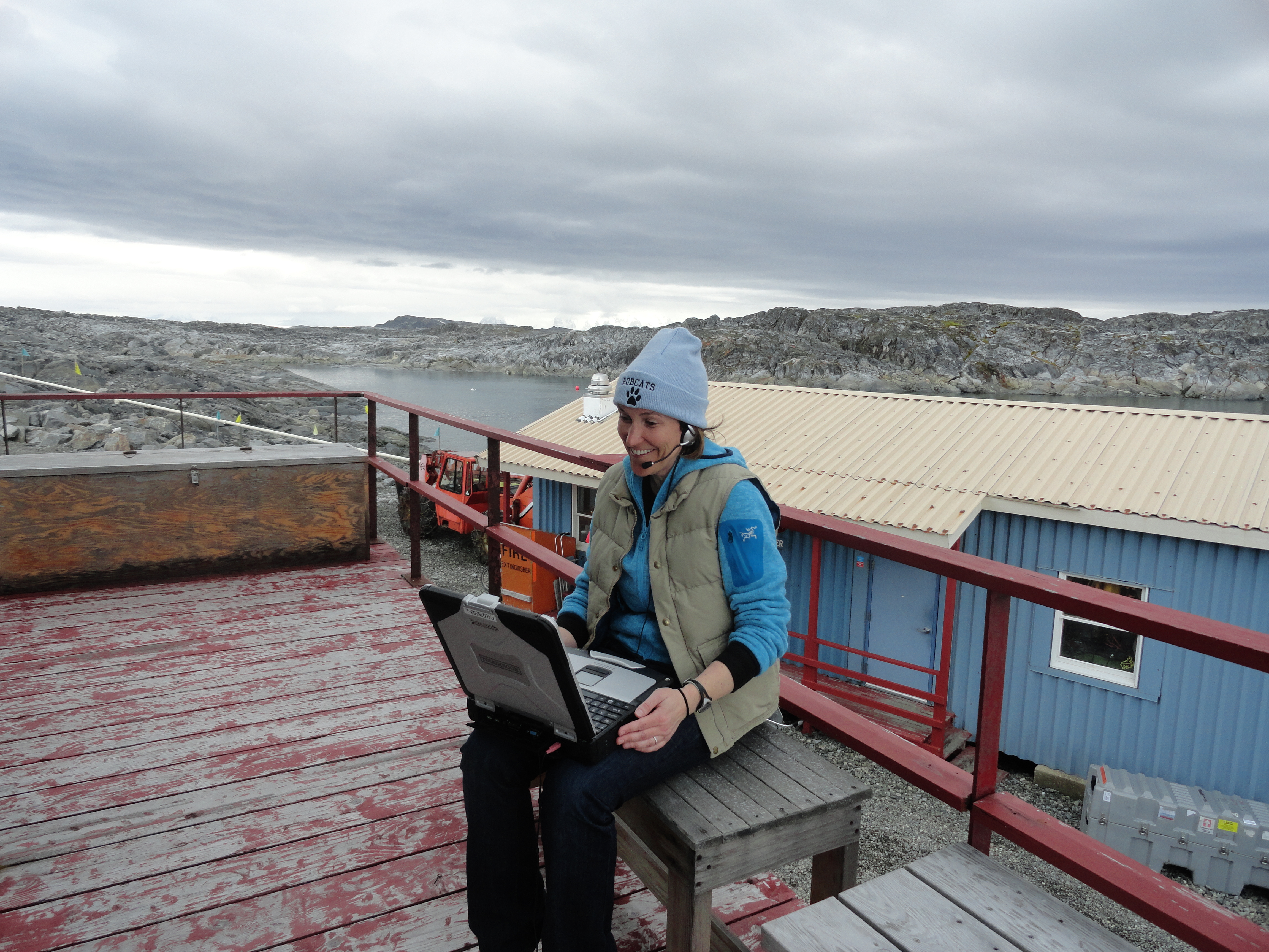Nell Herrmann talks to students from the Blue Hill Consolidated School in Maine. Palmer Station, Antarctica.