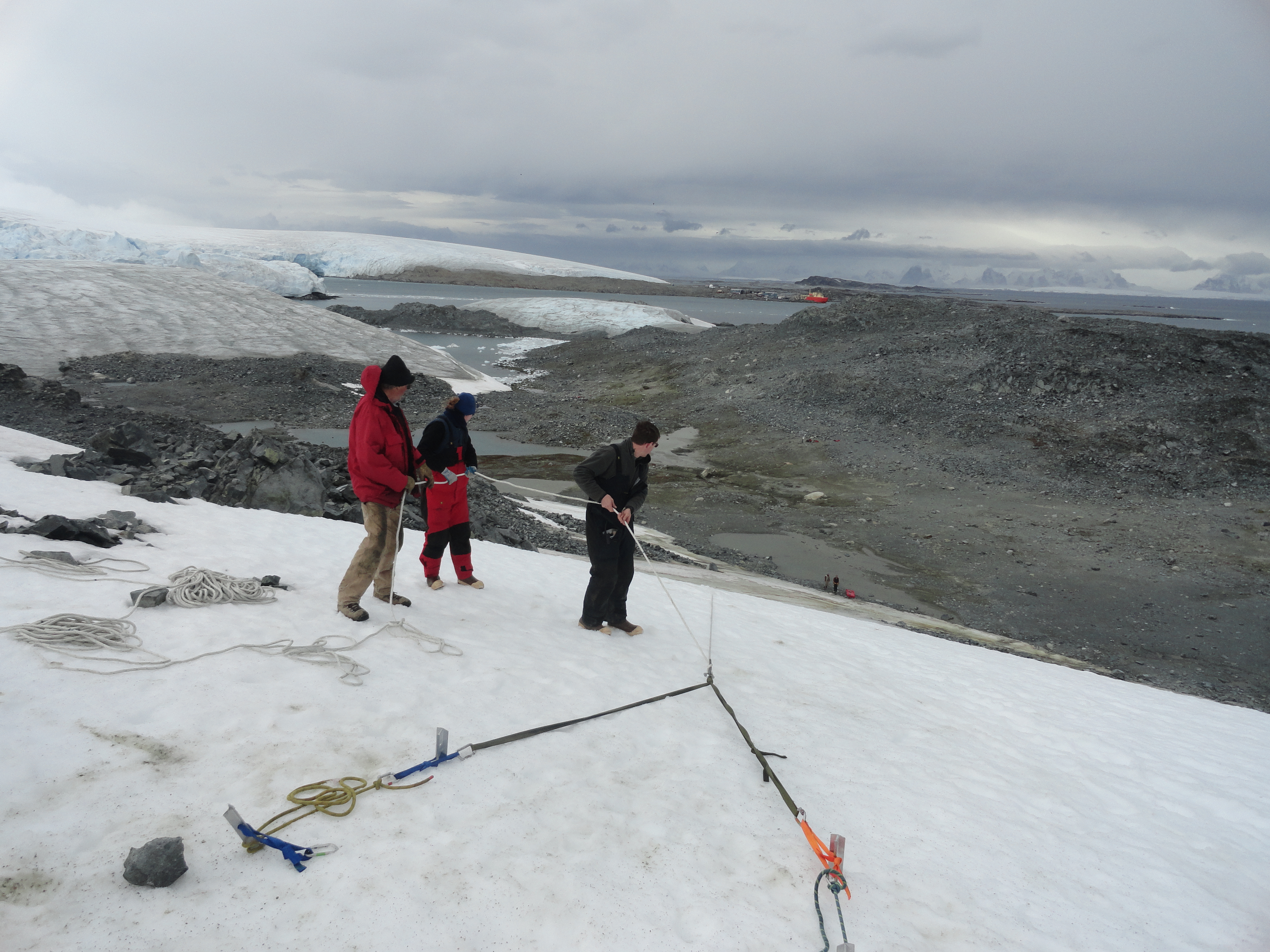 Scientists on Amsler Island lower a sled loaded with equipment. Palmer Station, Antarctica.