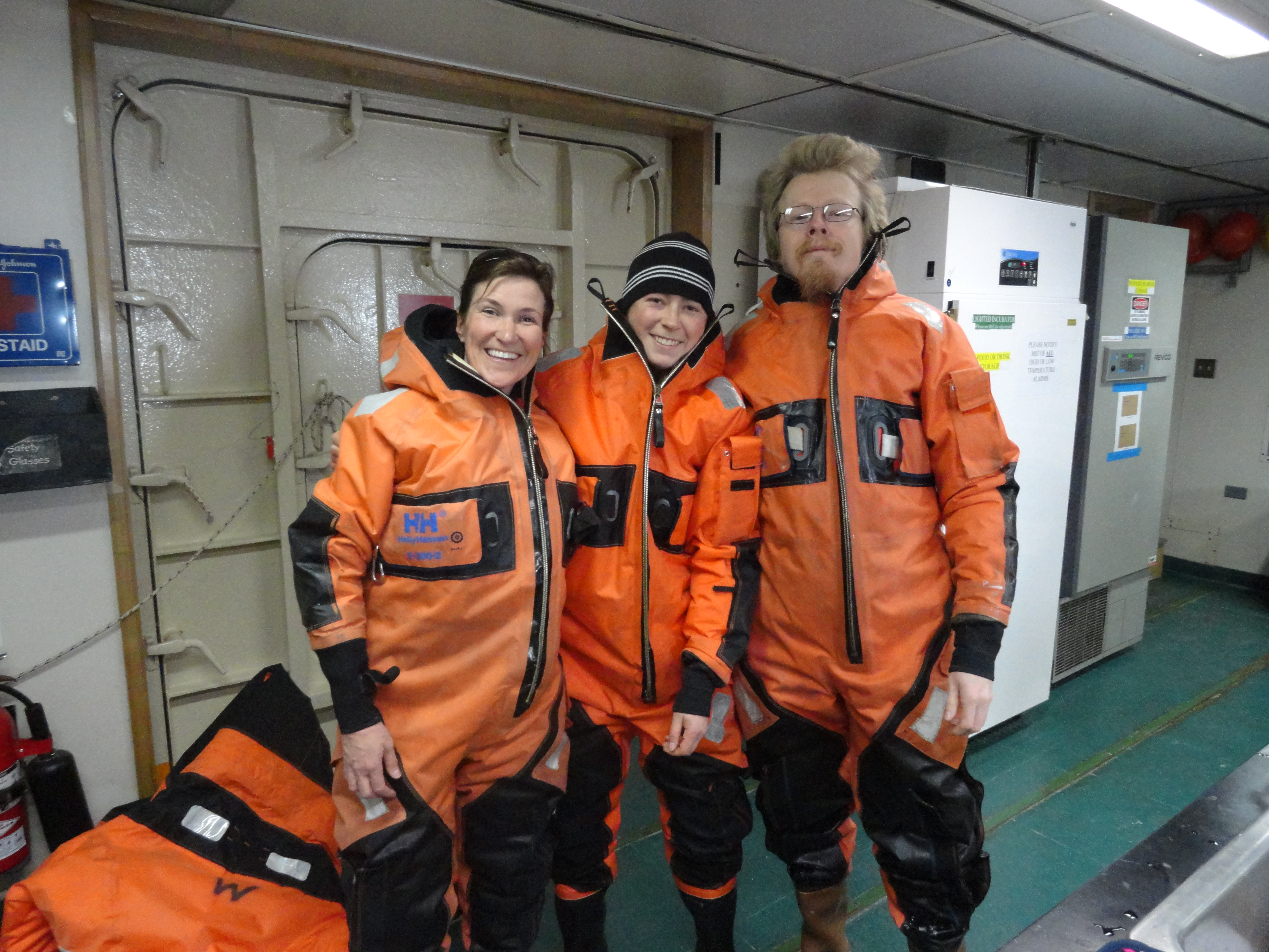Nell Herrmann poses with seal biologists. Aboard the RV Laurence M. Gould icebreaker at King George Island, Antarctica.