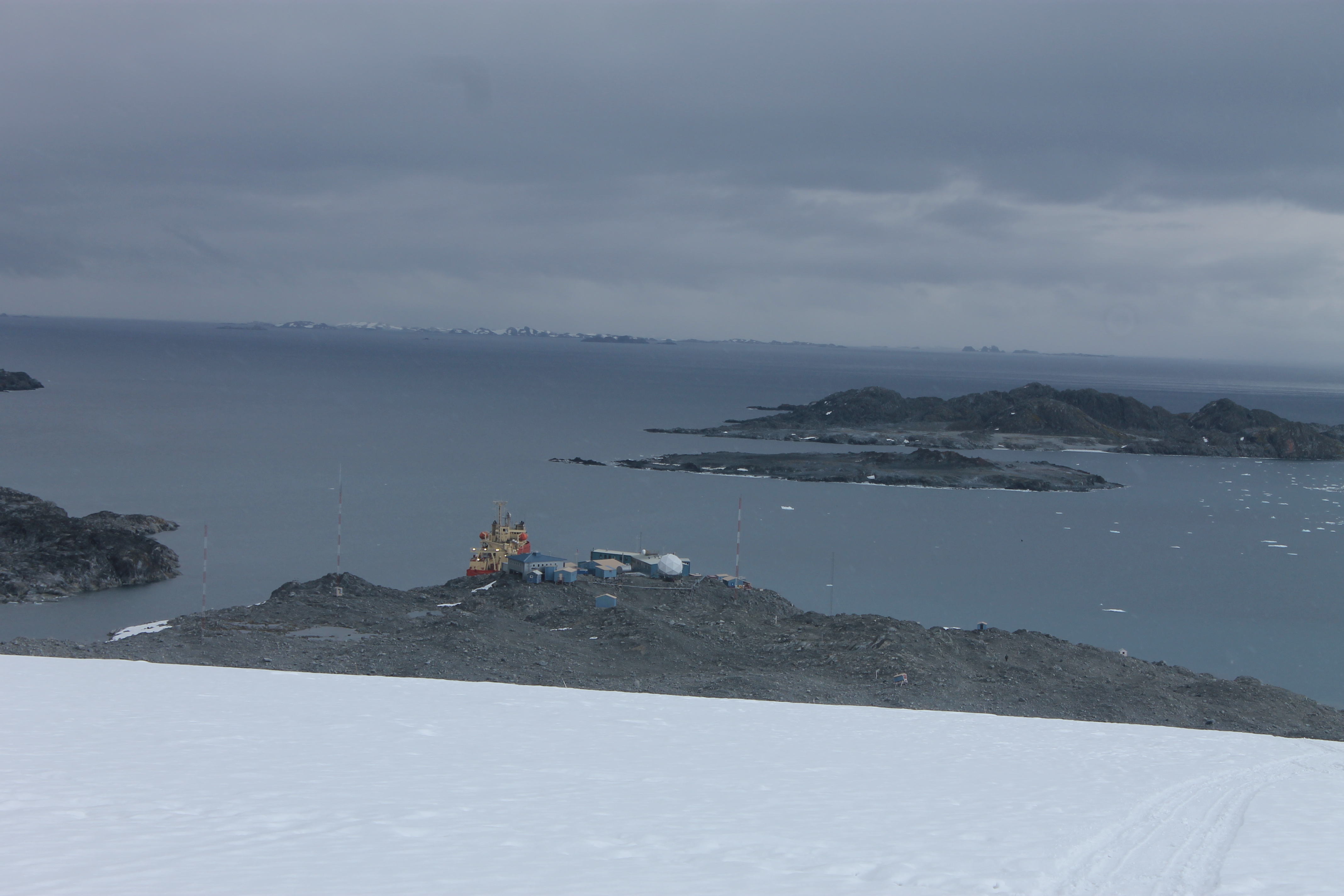 View of Palmer Station from the top of the Marr Glacier. Palmer Station, Antarctica.