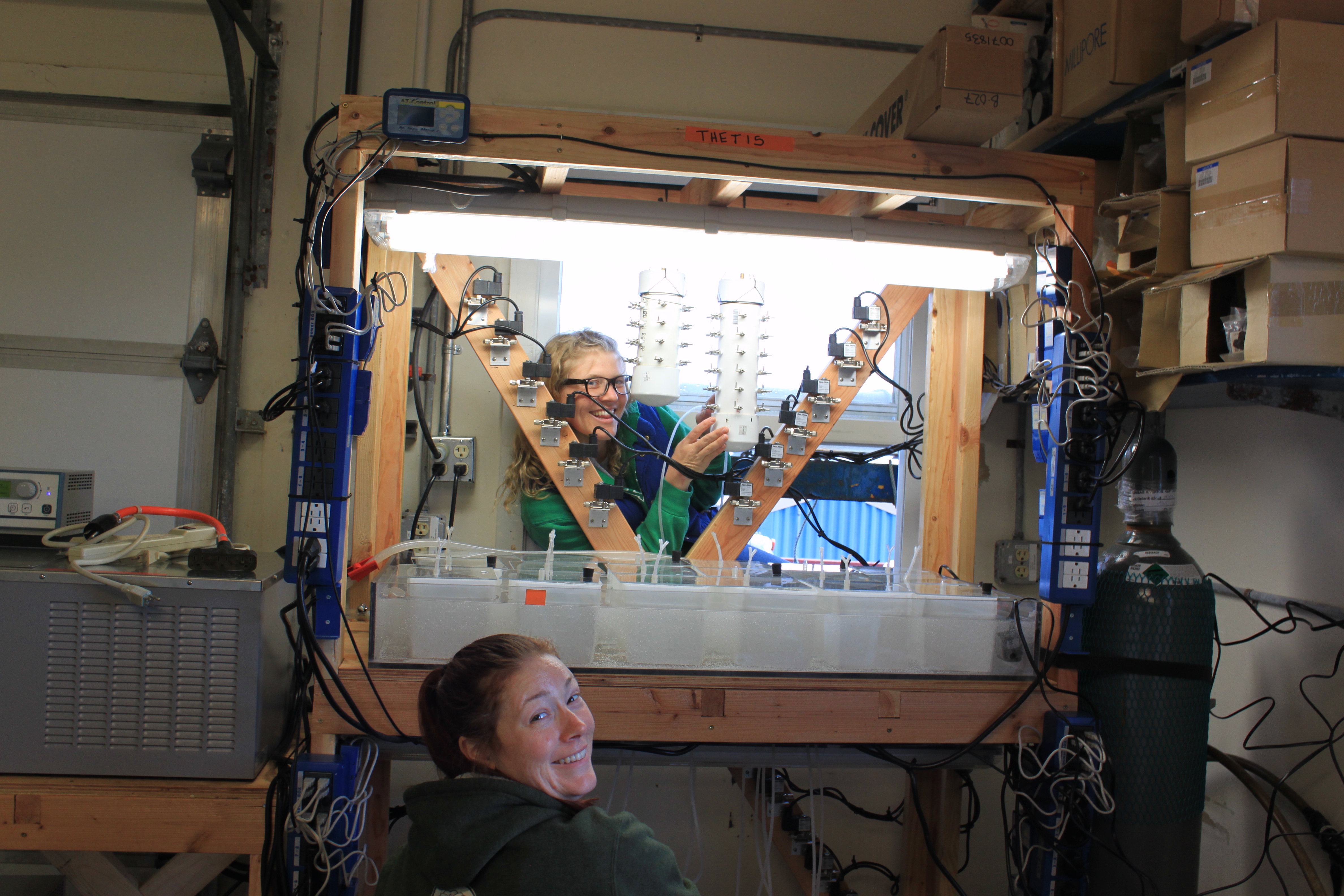 Julie Schram and Kate Schoenrock with the aqua medic table in the aquarium room. Palmer Station, Antarctica.