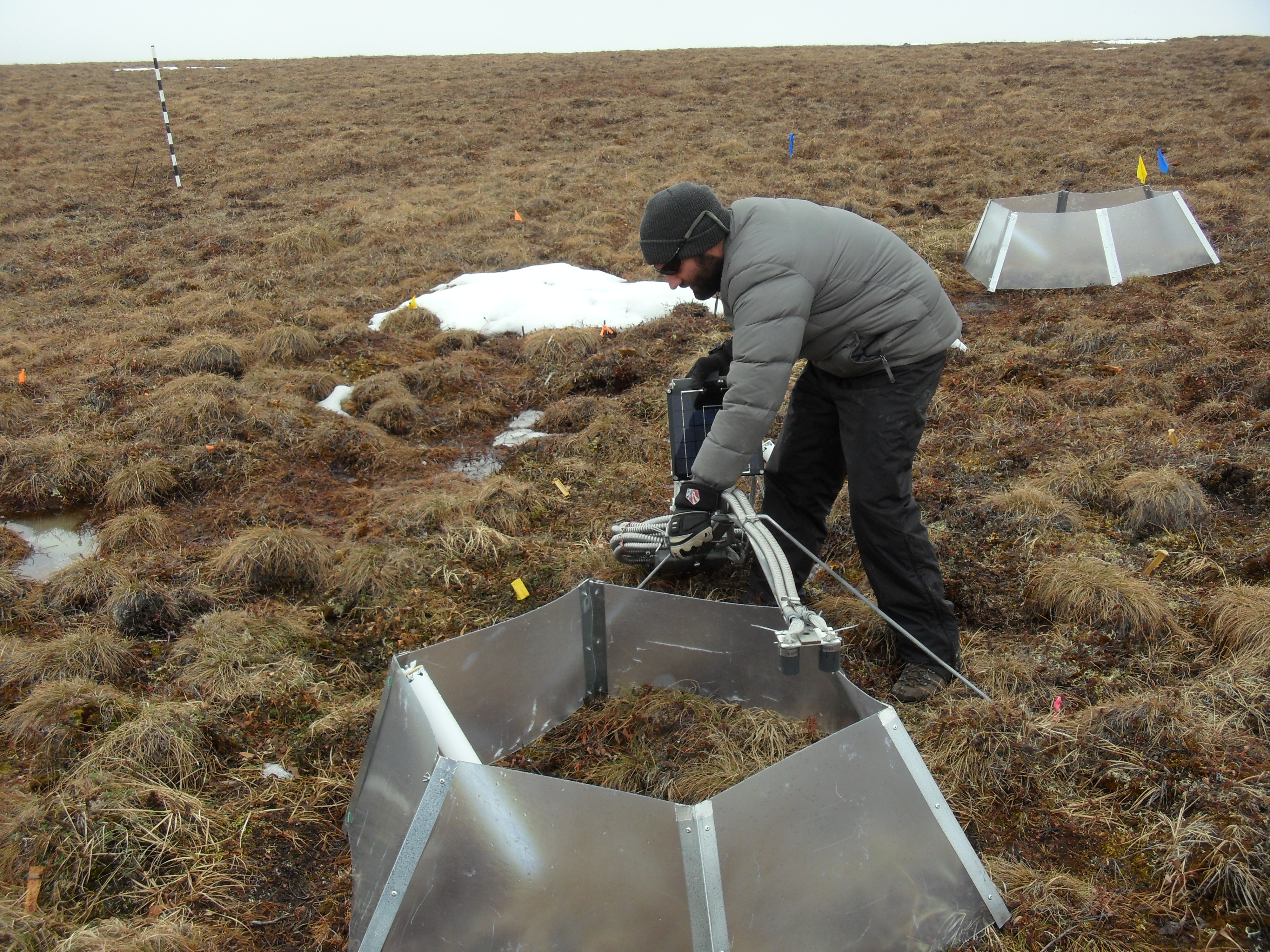 Anthony Darrouzet-Nardi deploys a mantis array over an open top warming chamber. At the snowmelt project plots north of Toolik Field Station, Alaska.