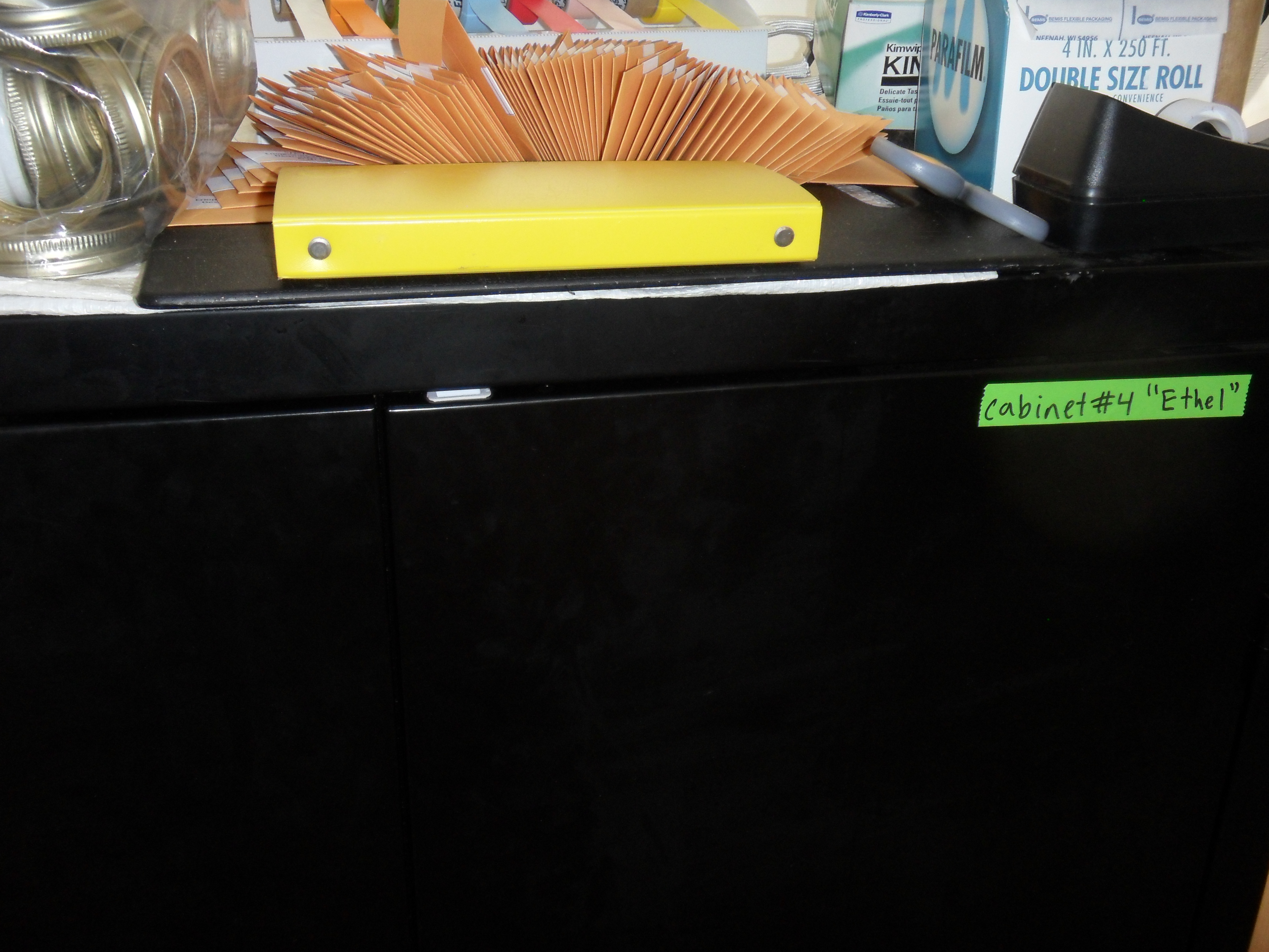 The cabinets in lab 6 tent have names for easy identification. In Lab 6 at Toolik Field Station, Alaska.