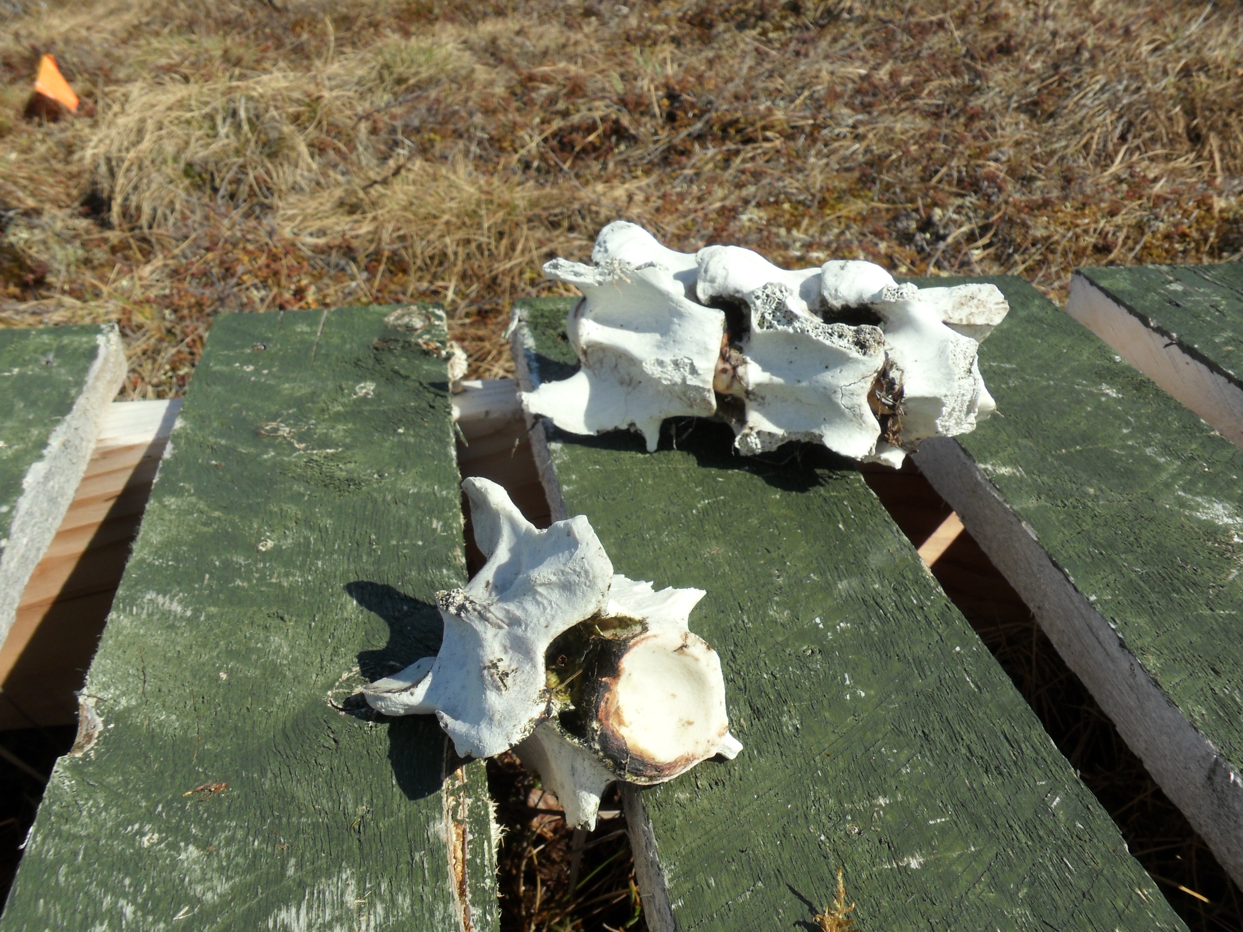 Caribou vertebrae lying on the boardwalk at the snowmelt project research site. Toolik Field Station, Alaska.