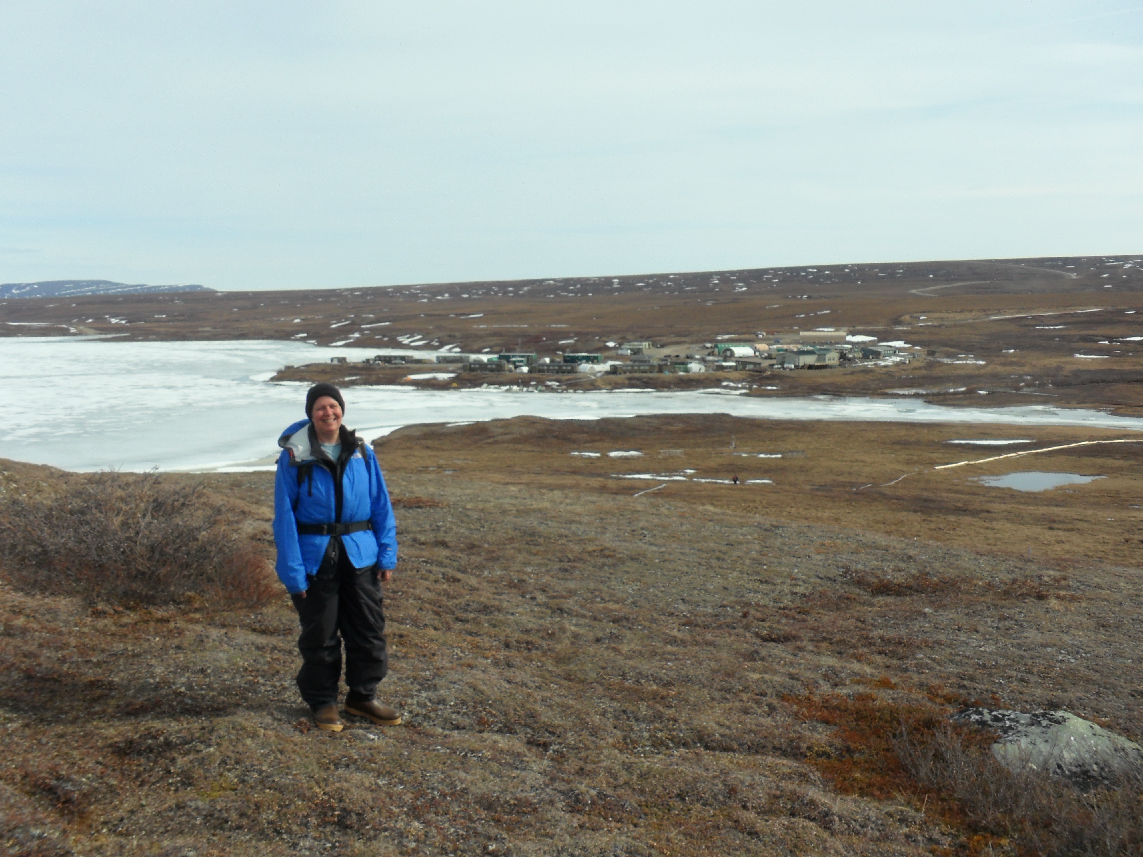 Susan Steiner poses with Toolik Field Station in the background. At the Natural Research Area in Toolik Field Station, Alaska.