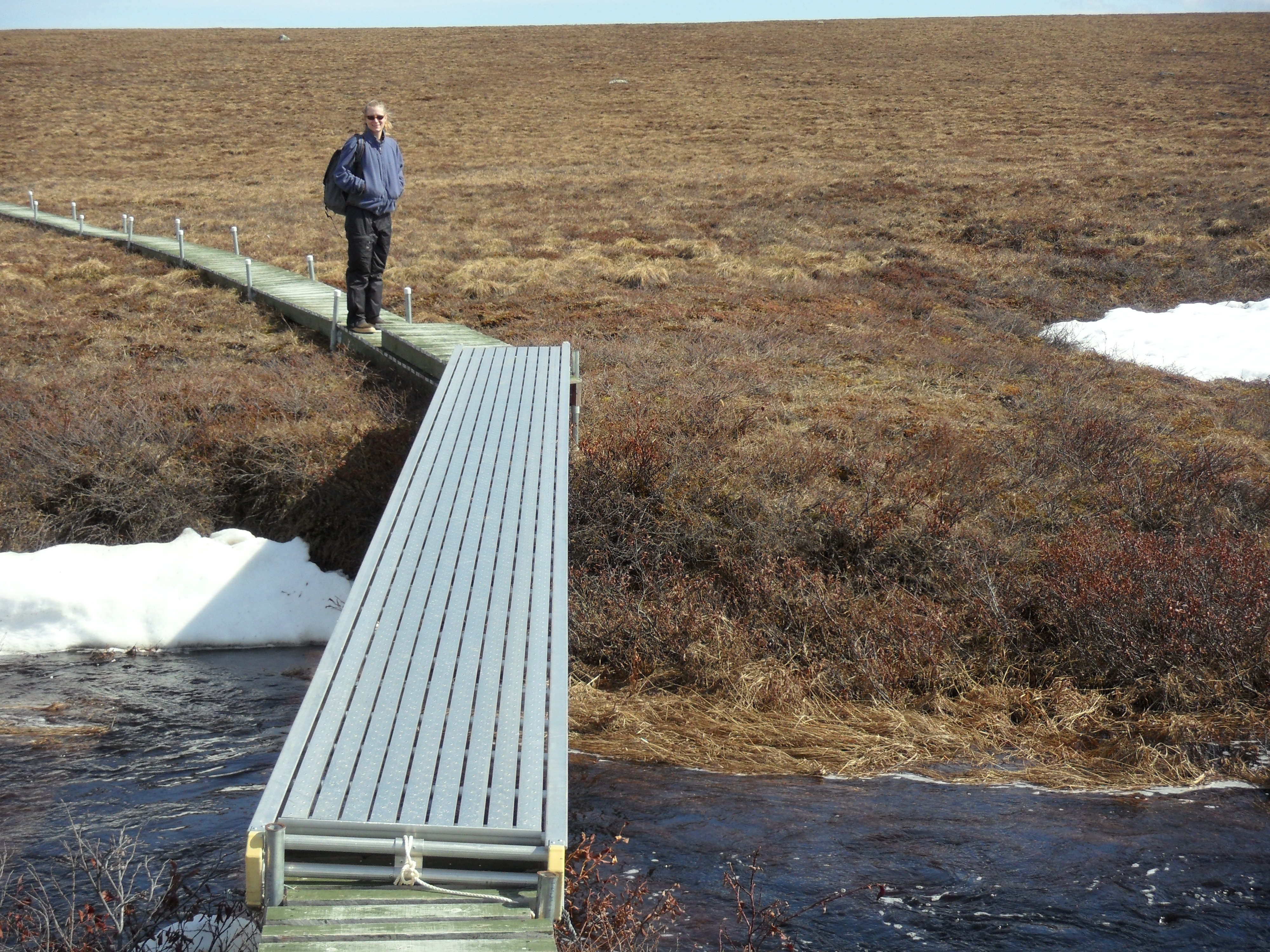 Caroline Melle prepares to cross a bridge over a stream. At the snowmelt project plots north of Toolik Field Station, Alaska.