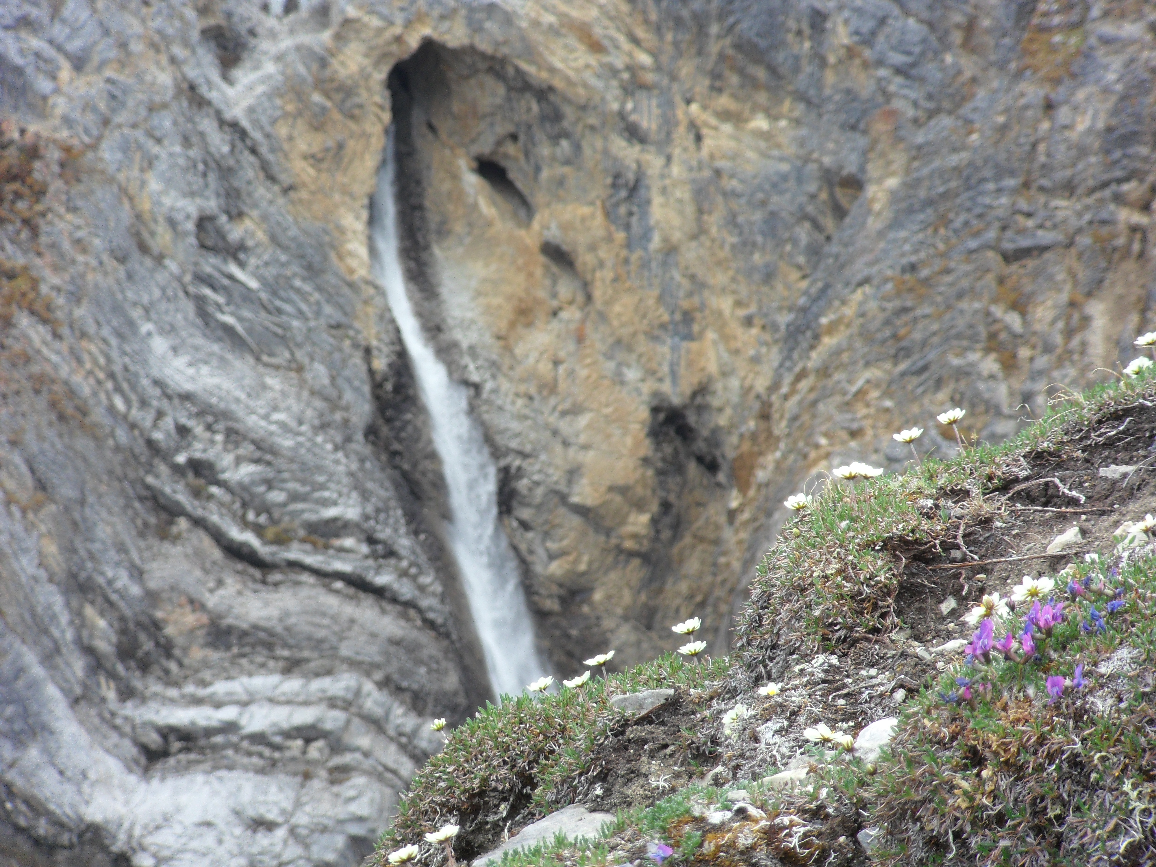 Atigun Falls drops out of the limestone cliff above the Atigun River Valley, Alaska.