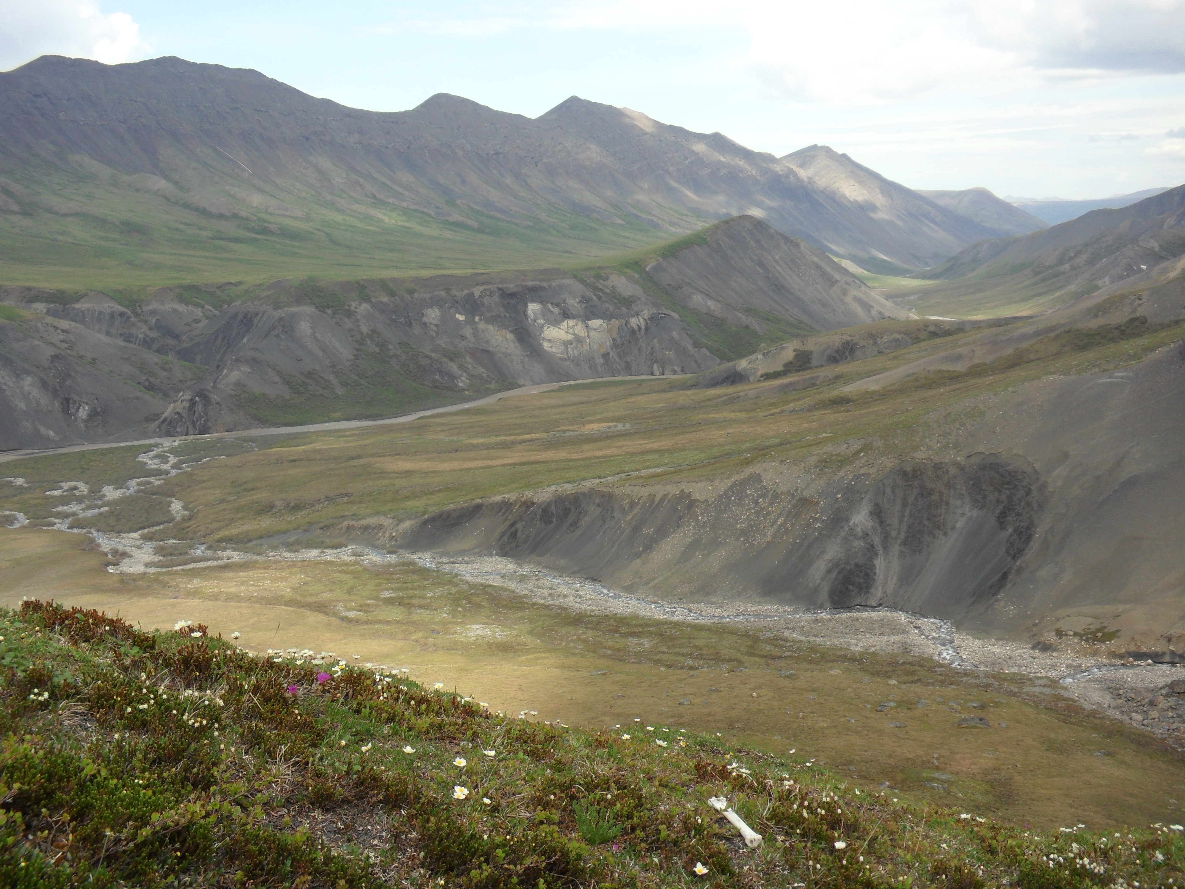 A view looking down the river valley past Atigun Falls. Atigun River Valley, Alaska.