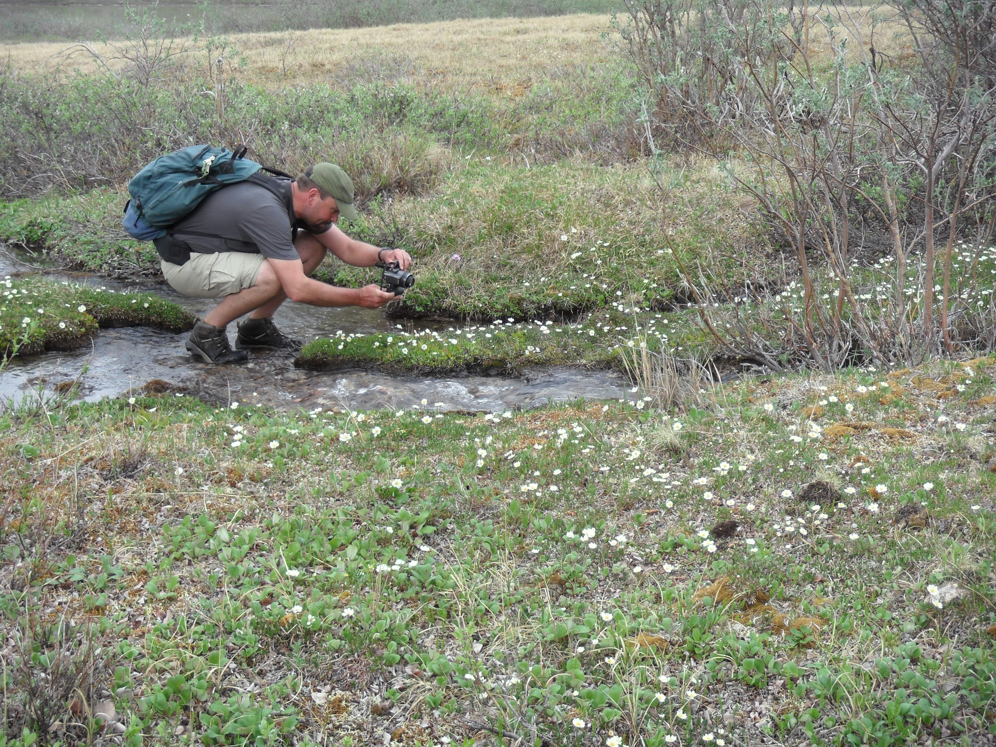PolarTREC teacher Nick LaFave photographs a stream scene in the Atigun River Valley, Alaska.