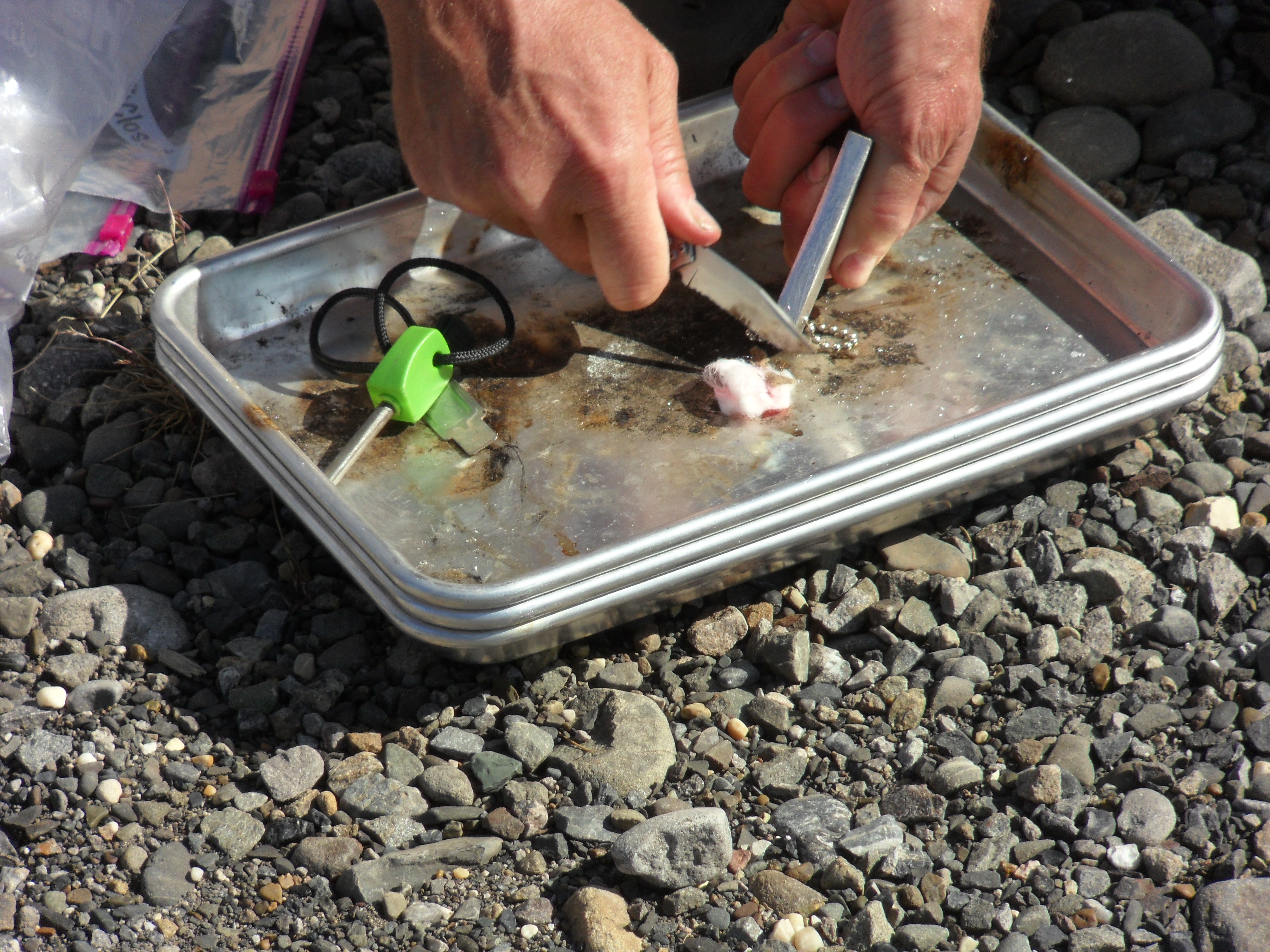 Allen O'Bannon starts a fire with a magnesium strip and a knife. Toolik Field Station, Alaska.