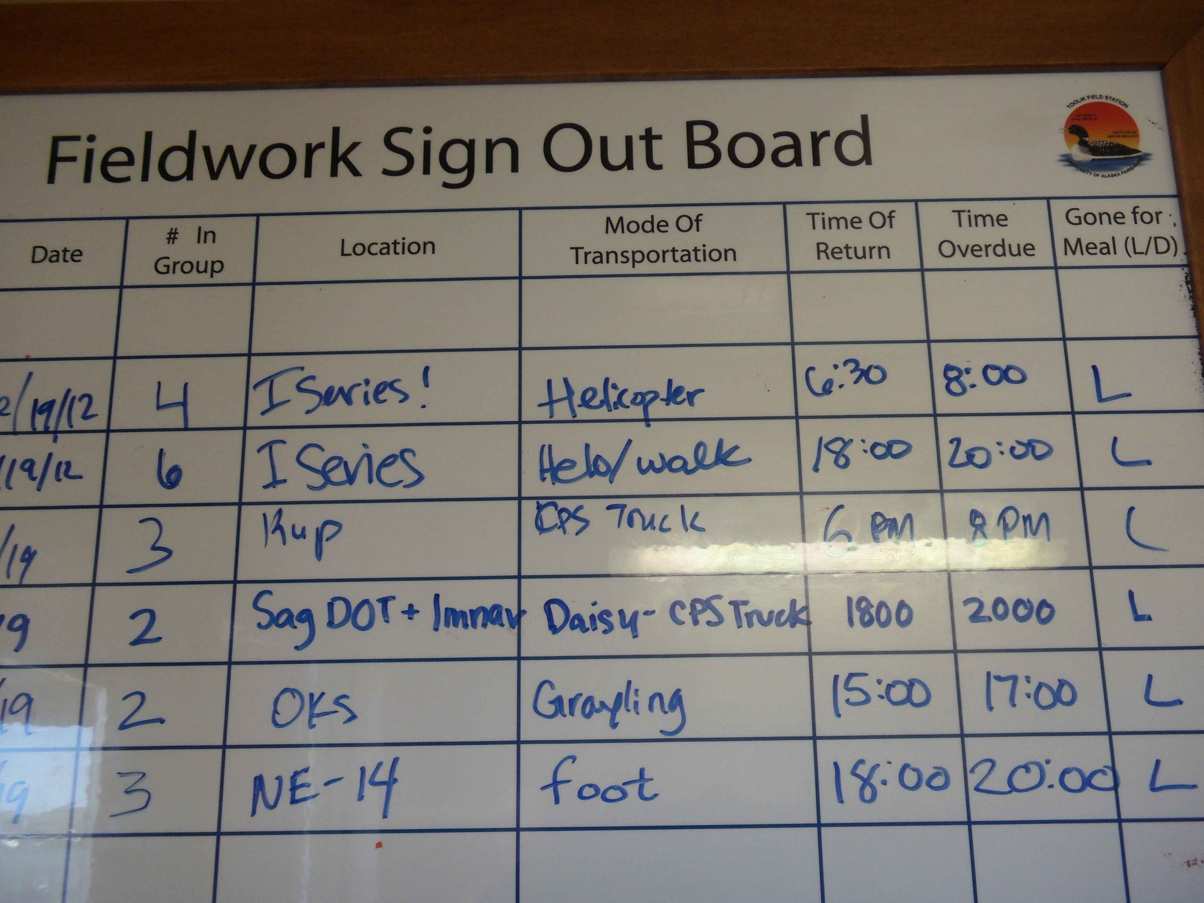 The daily fieldwork sign out board at Toolik Field Station, Alaska.