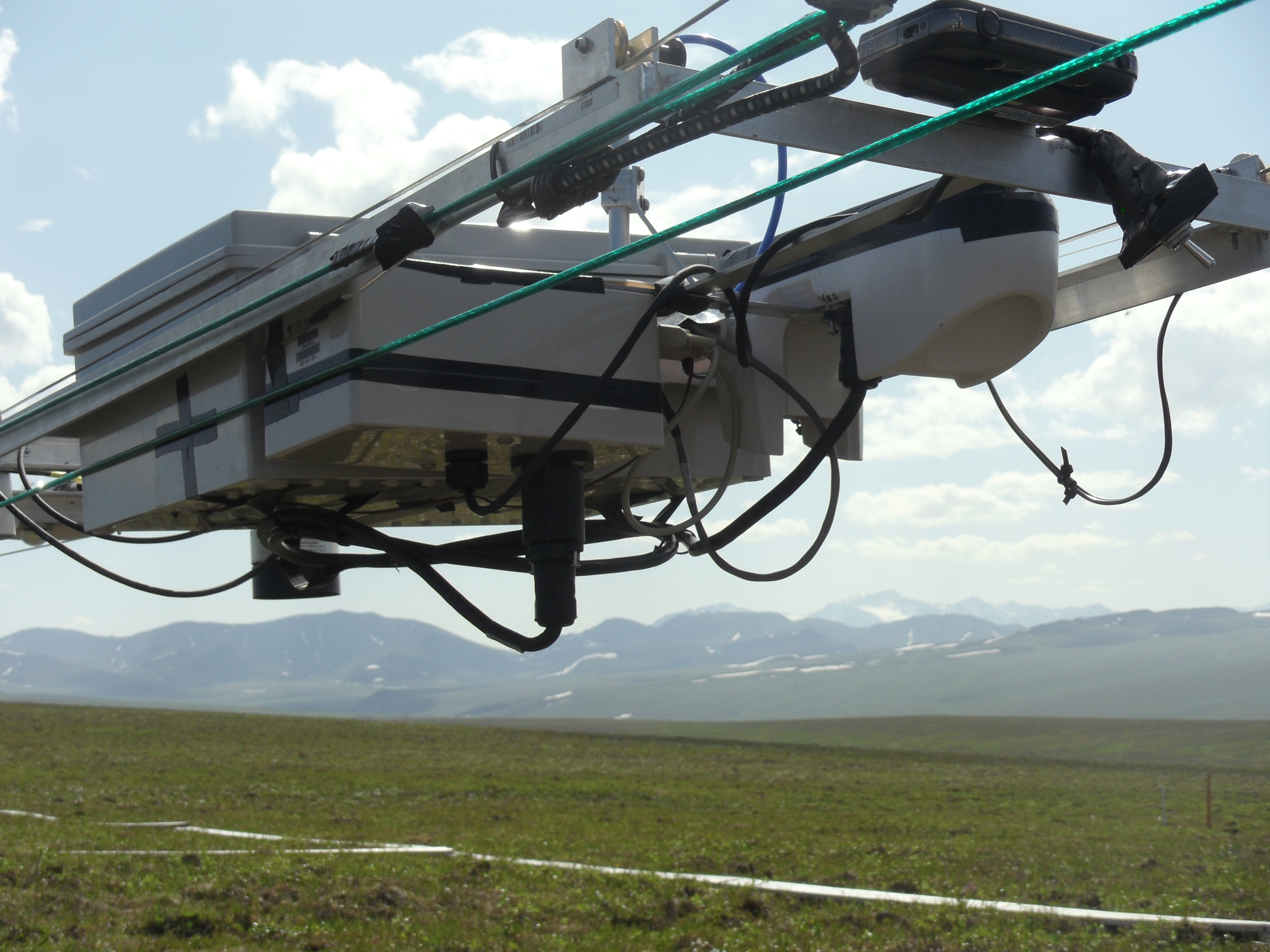 The NIMS (Networked Info Mechanical System) trolley robotic sensor platform with the Brooks Range in the background. Toolik Field Station, Alaska.