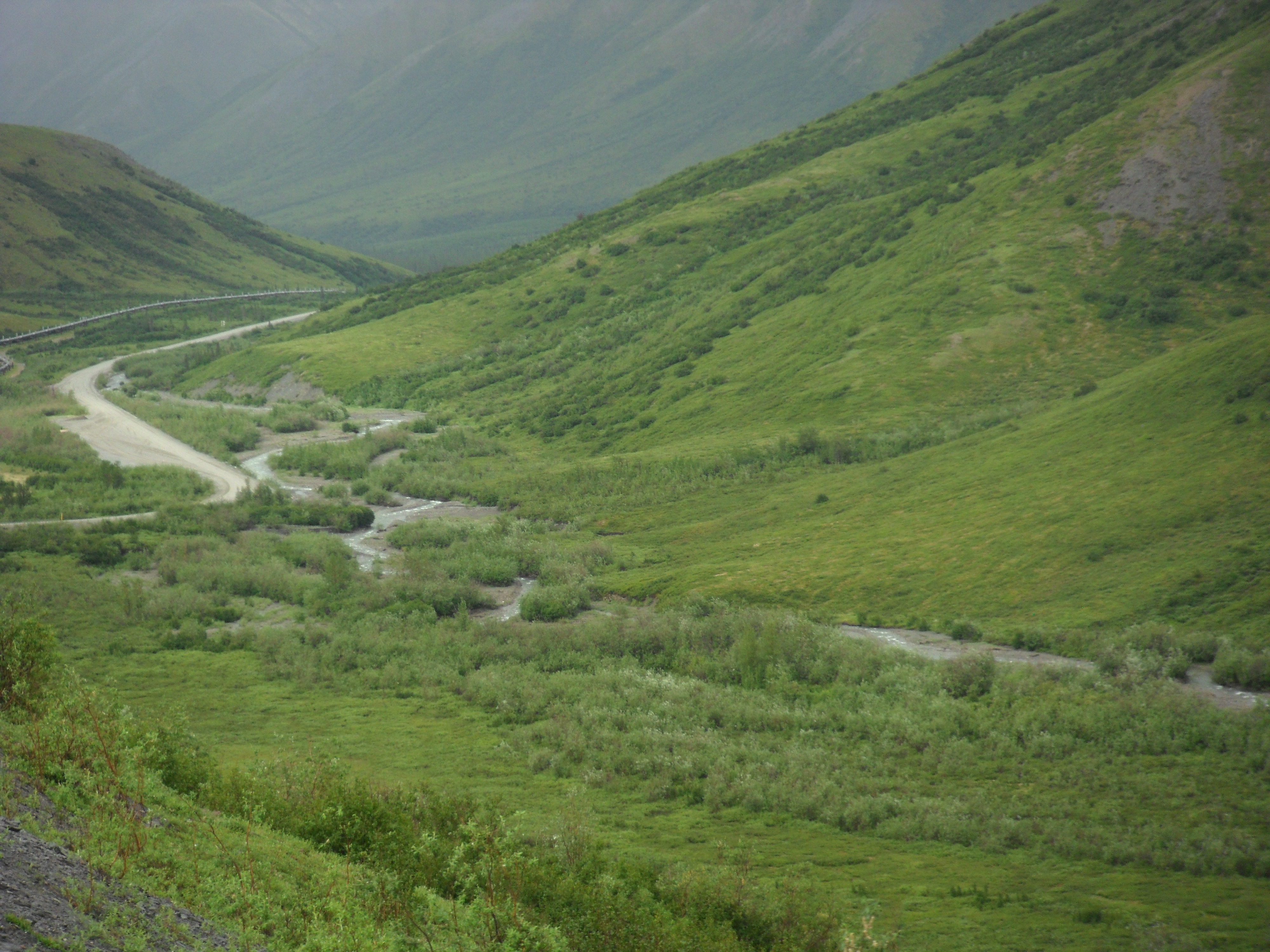 On Susan Steiner's trip down the Dalton Highway back to Fairbanks, the landscape is now green and lush. Dalton Highway, Alaska.