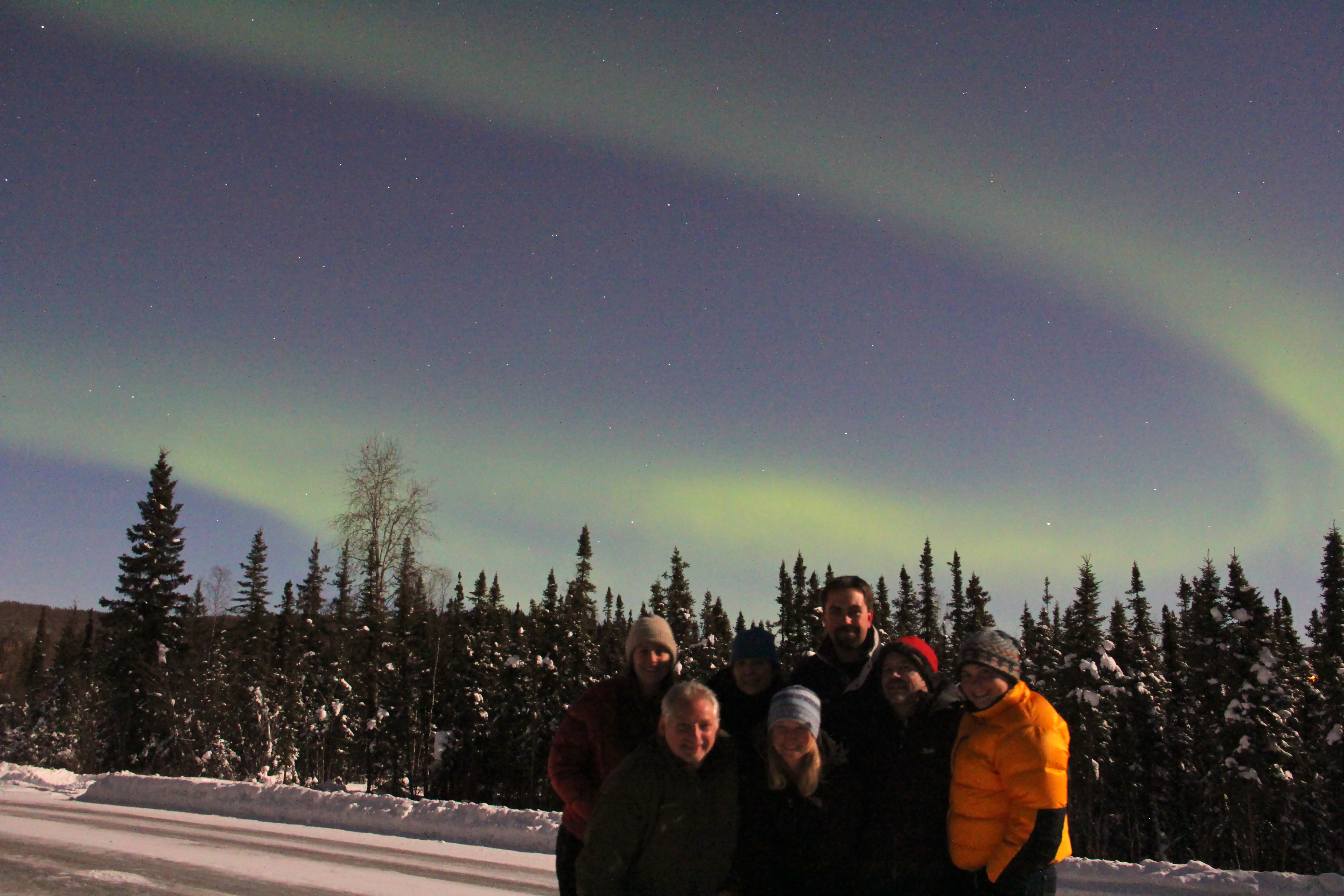Amber Lancaster, Lisa Seff, Nick LaFave, Tim Spuck, Lindsay Knippenberg, Mark Paricio, and Heidi Roop pose under the Aurora Borealis just outside of Fairbanks, Alaska.