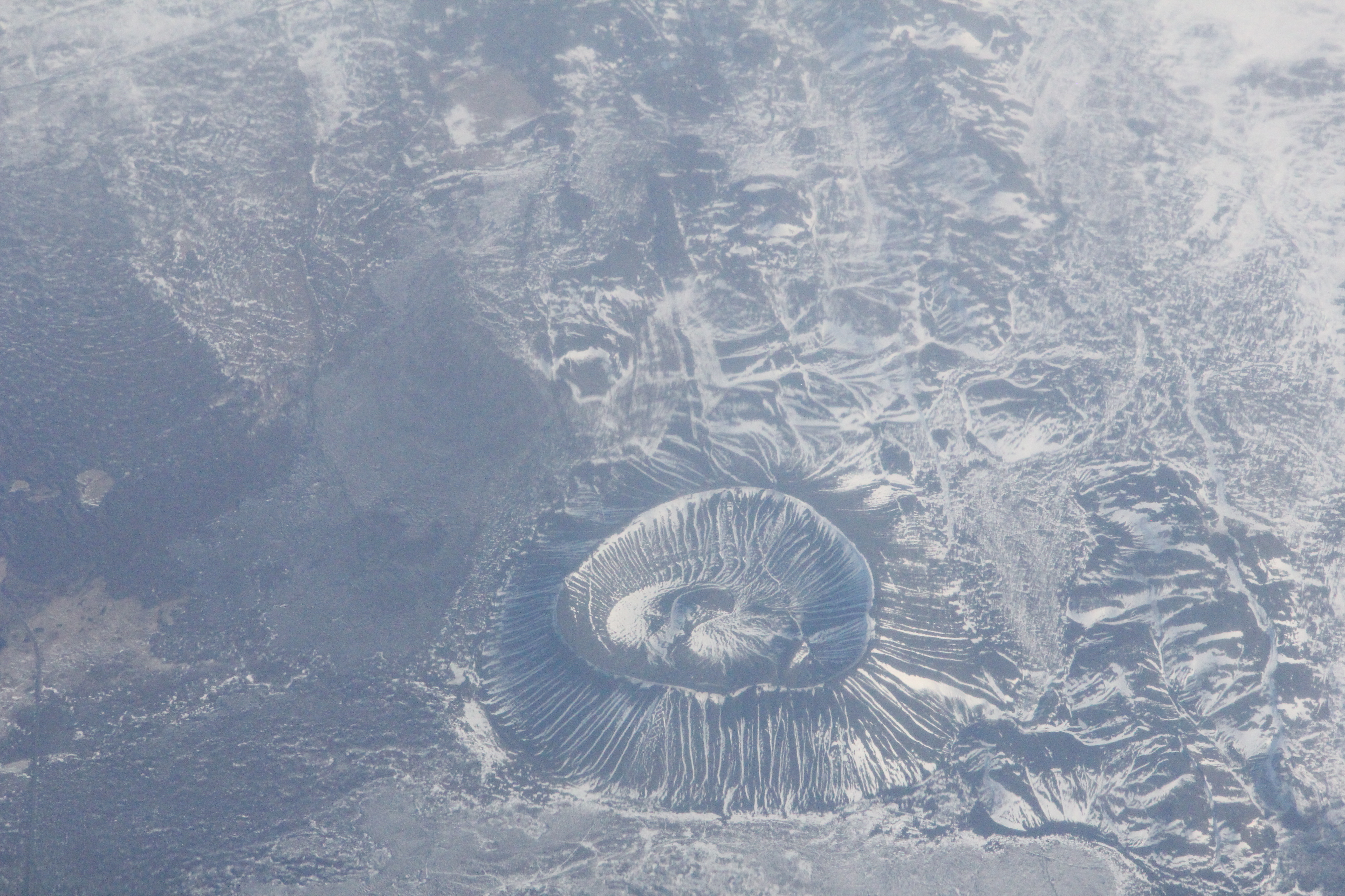 Tim Spuck: "My flight path from Copenhagen to Kangerlussuaq took me right over Iceland. Here is one of the many volcanic cones that cover the island." In the air over Iceland.