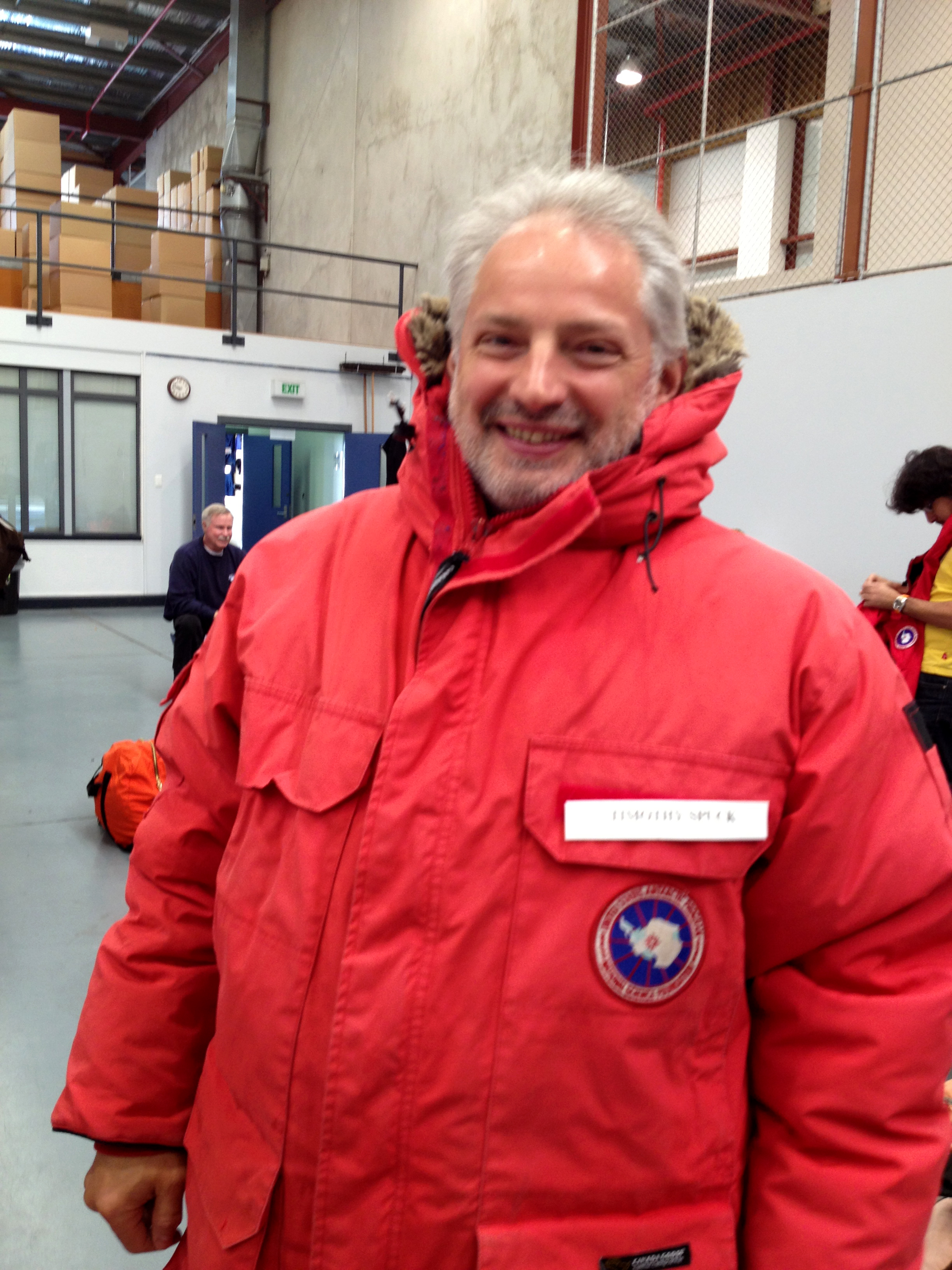Tim Spuck tries on Extreme Cold Weather gear. At the Clothing Distribution Center in Christchurch, New Zealand.