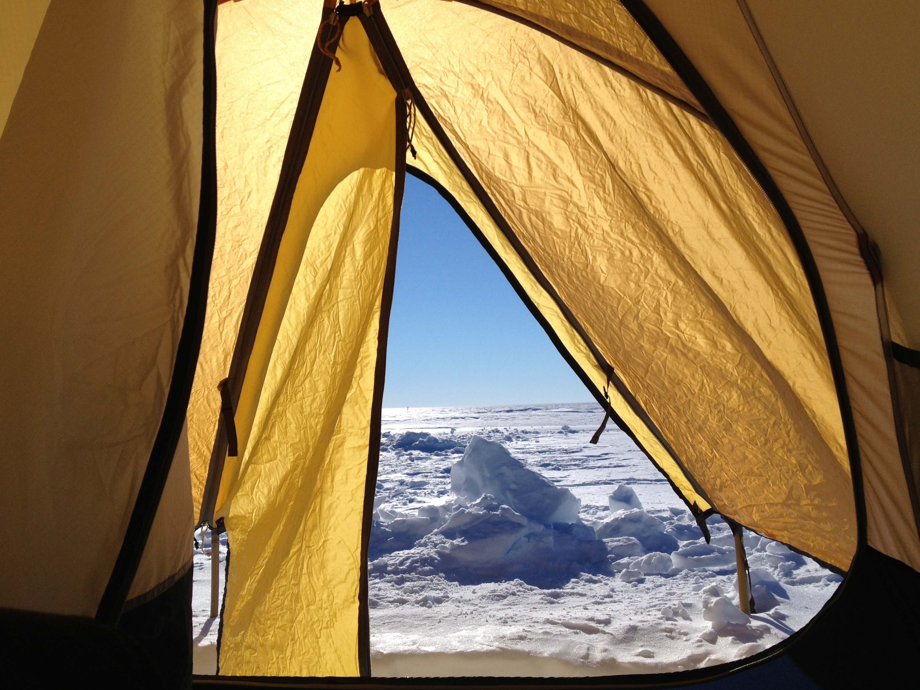 Tim Spuck: "View from inside my Scott tent. With the sun being up 24 hours a day, the air temperature inside the tent was often 40 F or better, however that didn't change the fact you were sleeping on a one inch thick foam pad that separated you from a slab of ice 2-miles thick." Automatic Geophysical Observatory (AGO) #2 Site on the East Antarctic Plateau.
