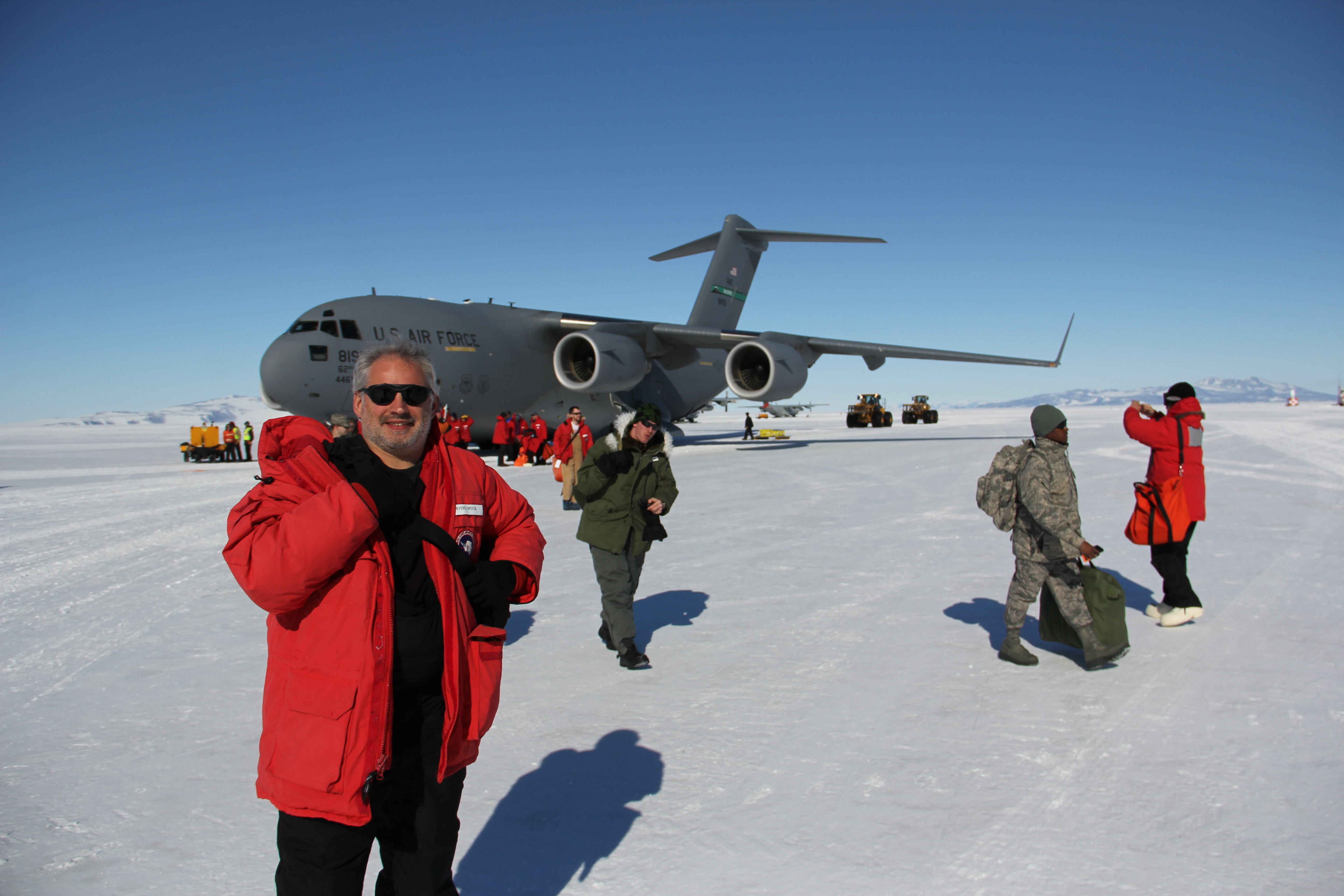 Tim Spuck: "Stepping out of the C-17 aircraft onto Antarctica. Winds were out of the north when we landed so the weather here was a bit warmer than normal -- in the 30's." McMurdo Station, Antarctica.