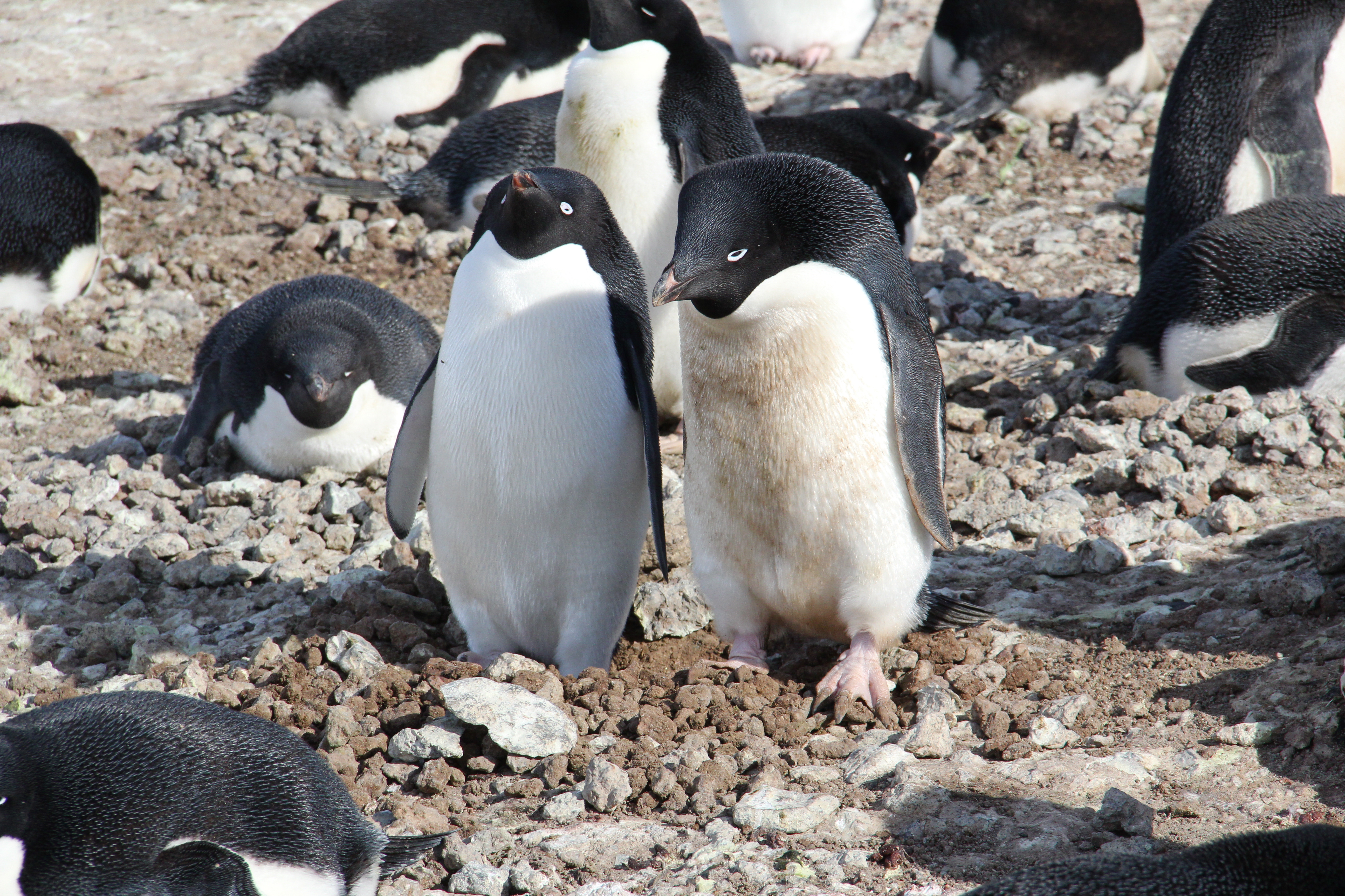 Tim Spuck: "These two Adélie Penguins are mates. Notice one of the penguins has a dirty chest and the other one is clean. The clean one has just returned from feeding in the ocean to relieve its mate from nesting duties so she/he can go out can go out and feed. You can tell they are mates because they are standing next to each other near a nest of rocks. If this were not a mated pair, they would be fighting." Cape Royds, Antarctica.