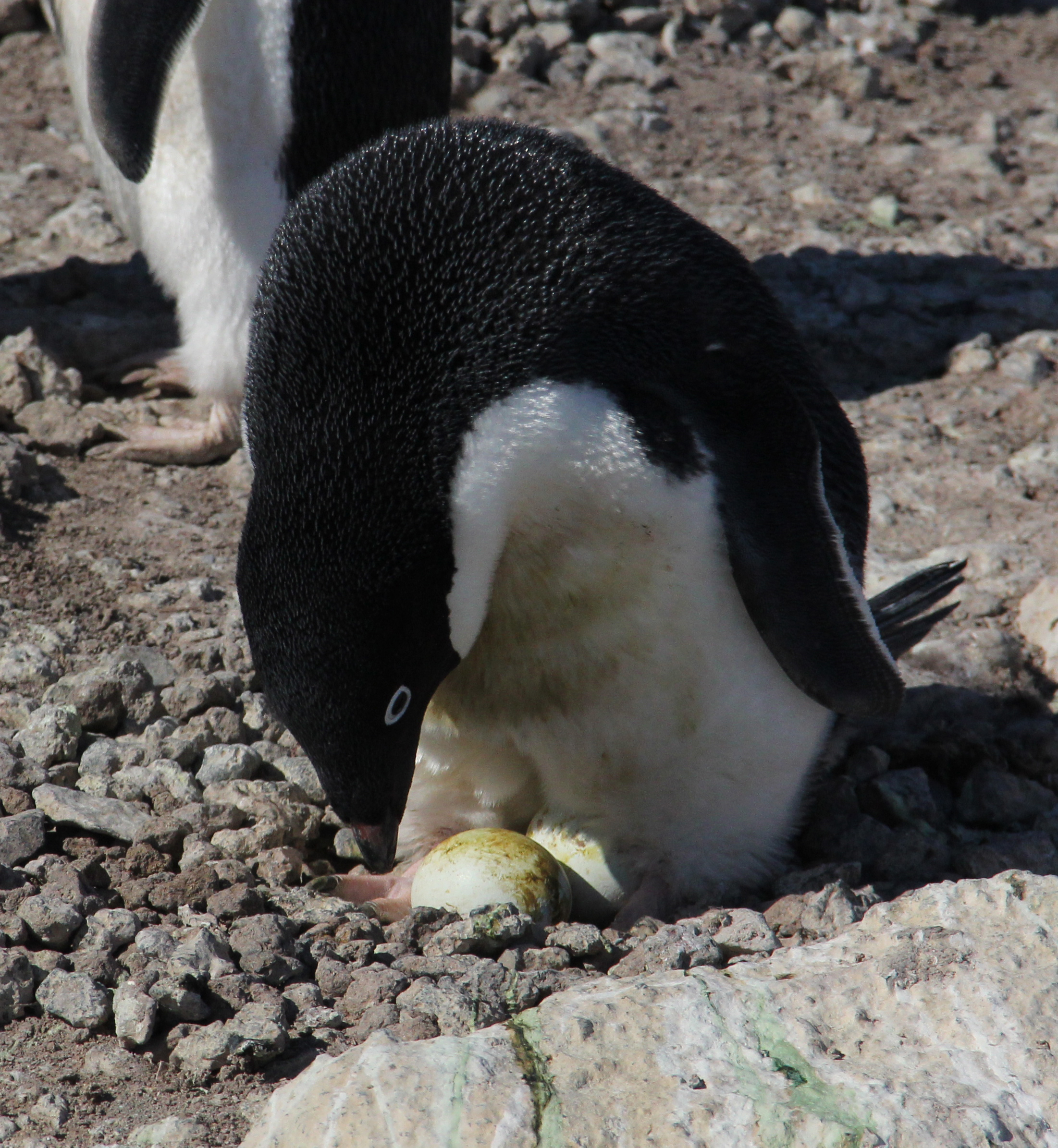 An Adelie penguin tends to its two eggs in its rock nest. Cape Royds, Antarctica.